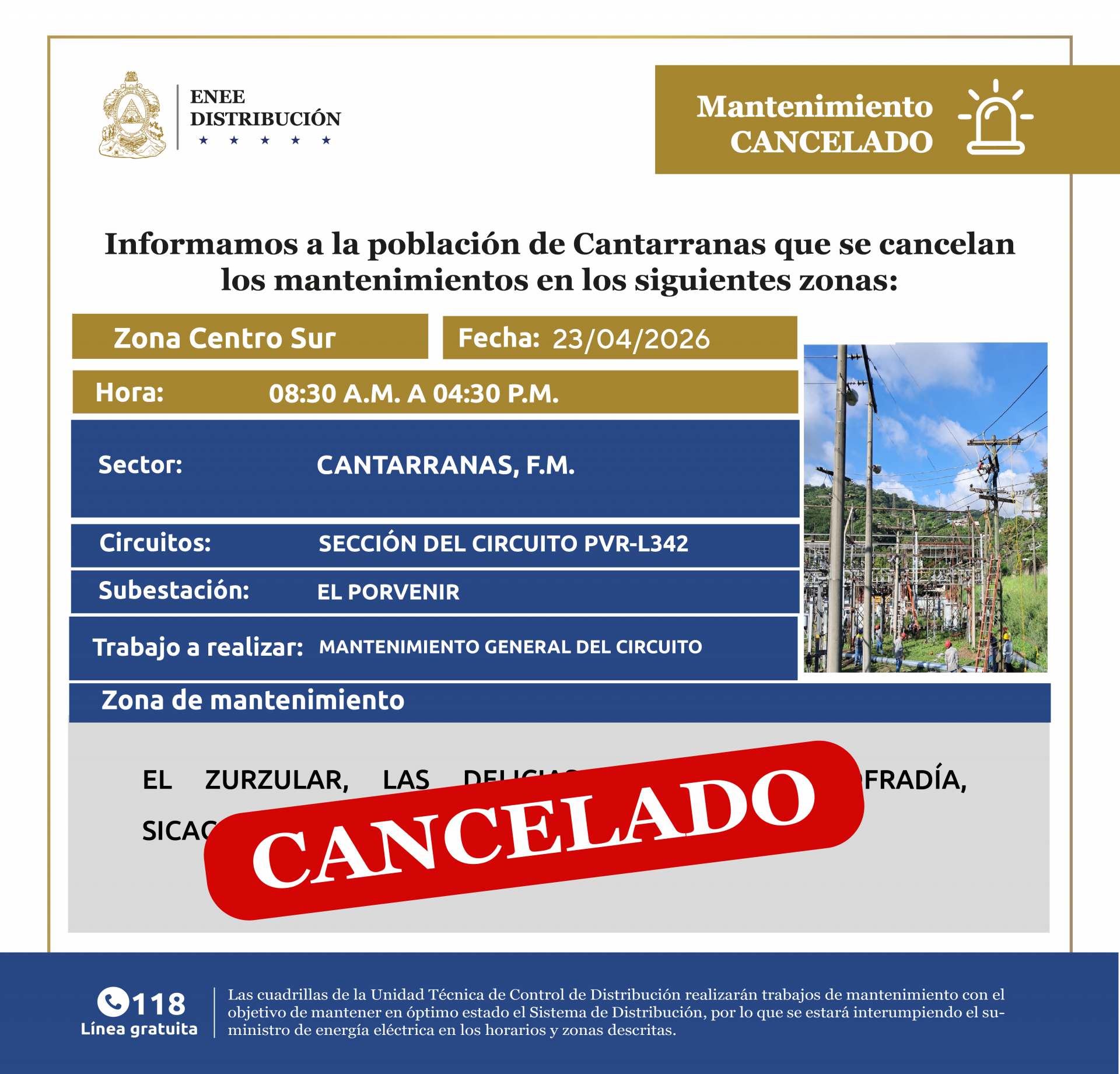 Avisos de Mantenimiento Cancelación - Centro Sur Cantarranas jueves 23 de abril de 2026