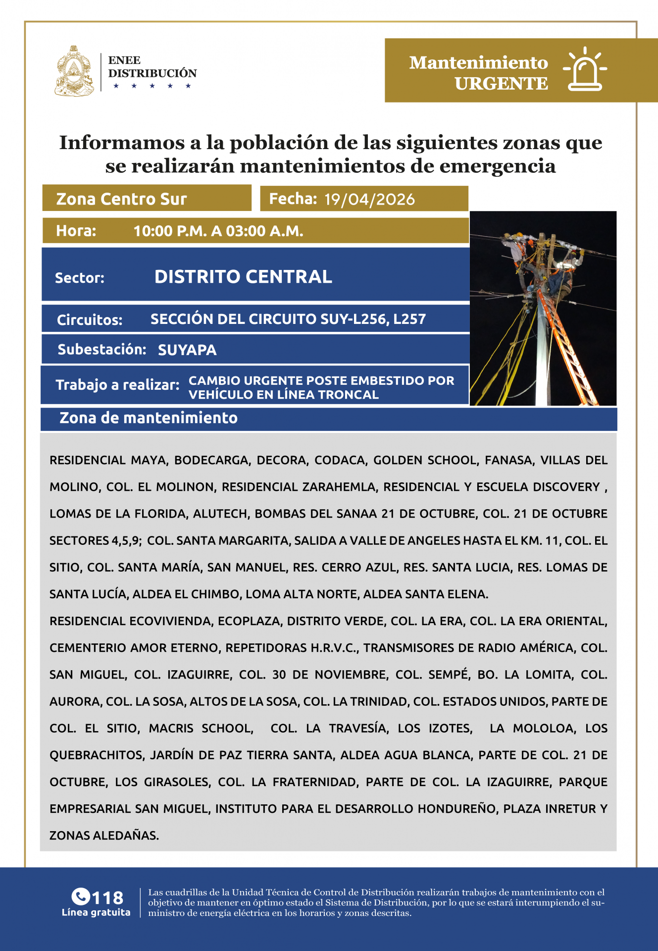 Avisos de Mantenimiento Emergencia - Centro Sur Distrito Central domingo 19 de abril de 2026