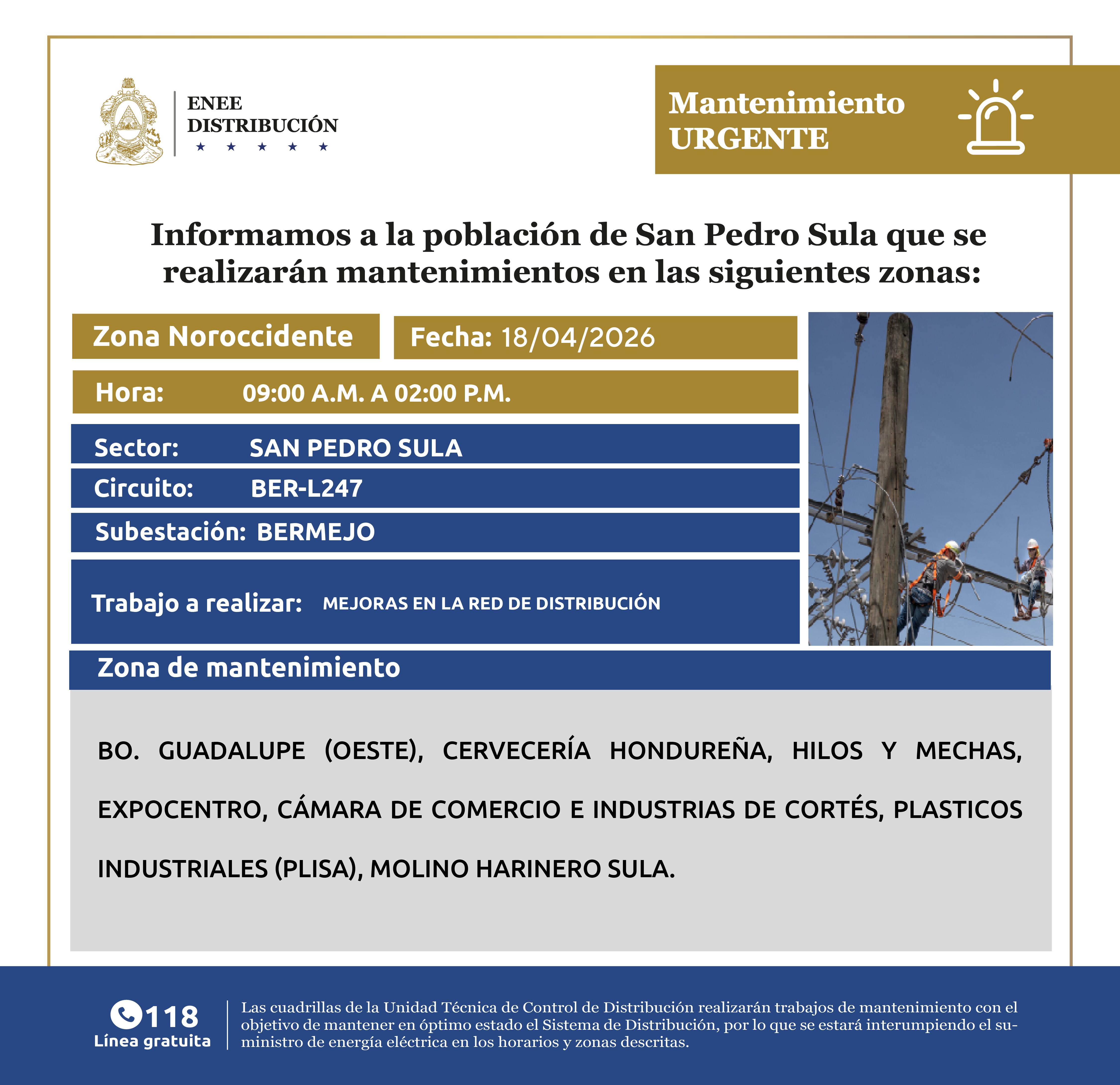 Avisos de Mantenimiento Emergencia - Noroccidente San Pedro Sula Sábado 18 de abril de 2026