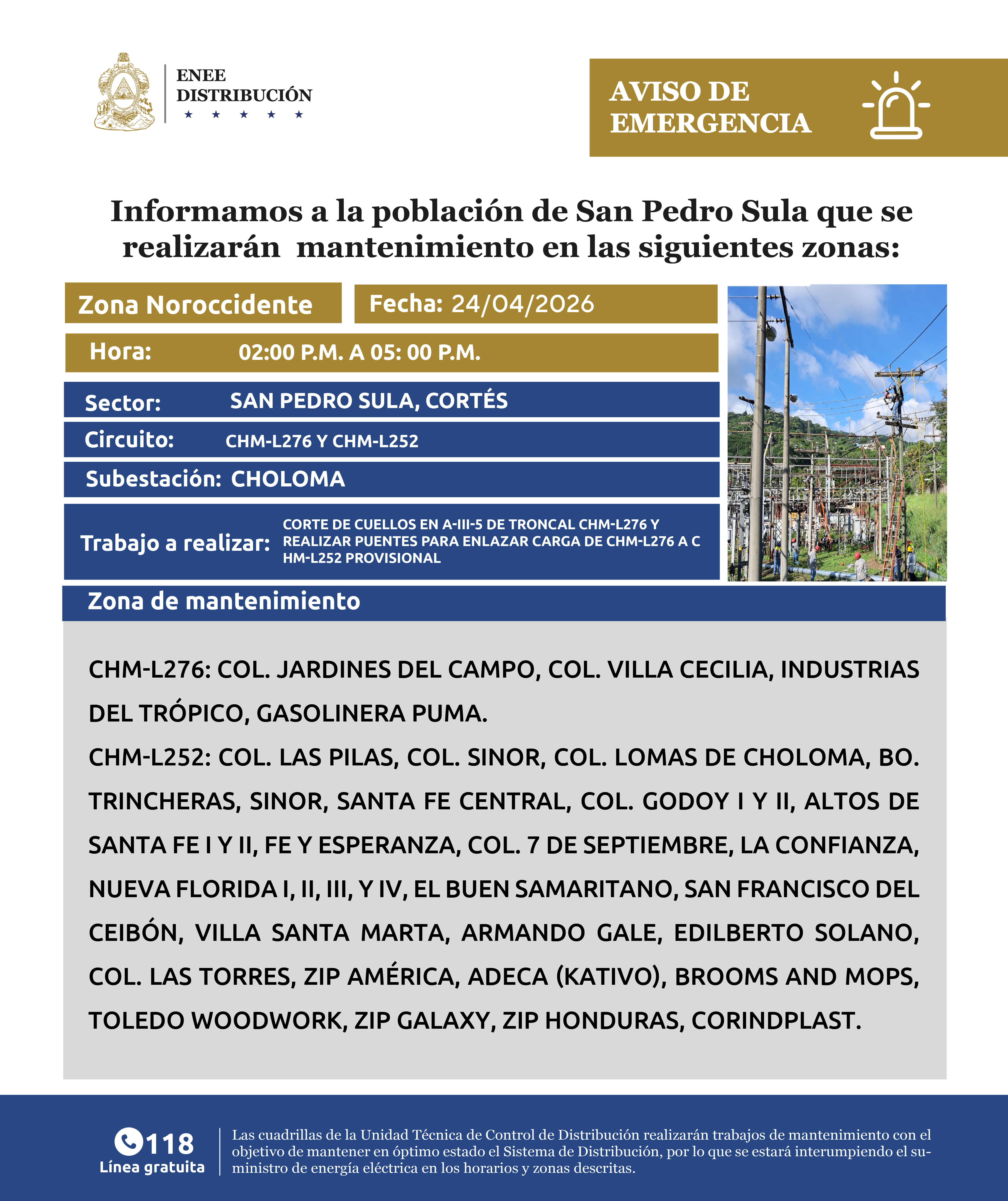 Avisos de Mantenimiento Emergencia - Noroccidente San Pedro Sula viernes 24 de abril de 2026