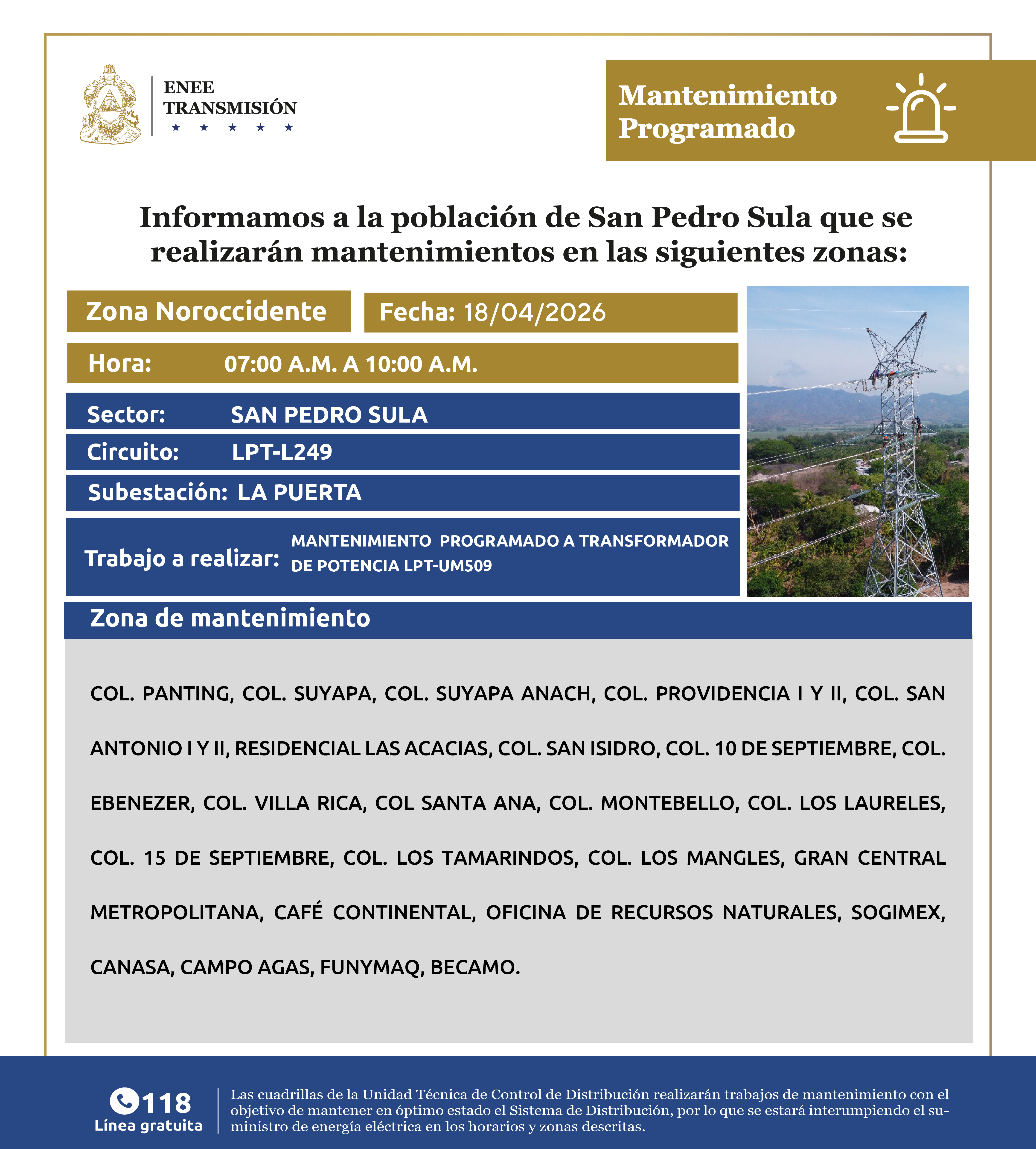 Avisos de Mantenimiento Programado - Noroccidente San Pedro Sula Sábado 18 de abril de 2026
