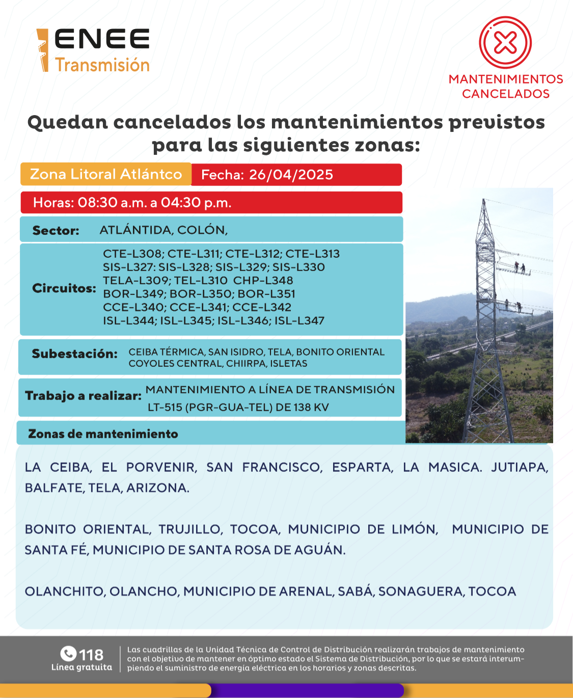 Aviso de Mantenimiento Cancelación - Zona Litoral Atlántico sábado 26 abril de 2025