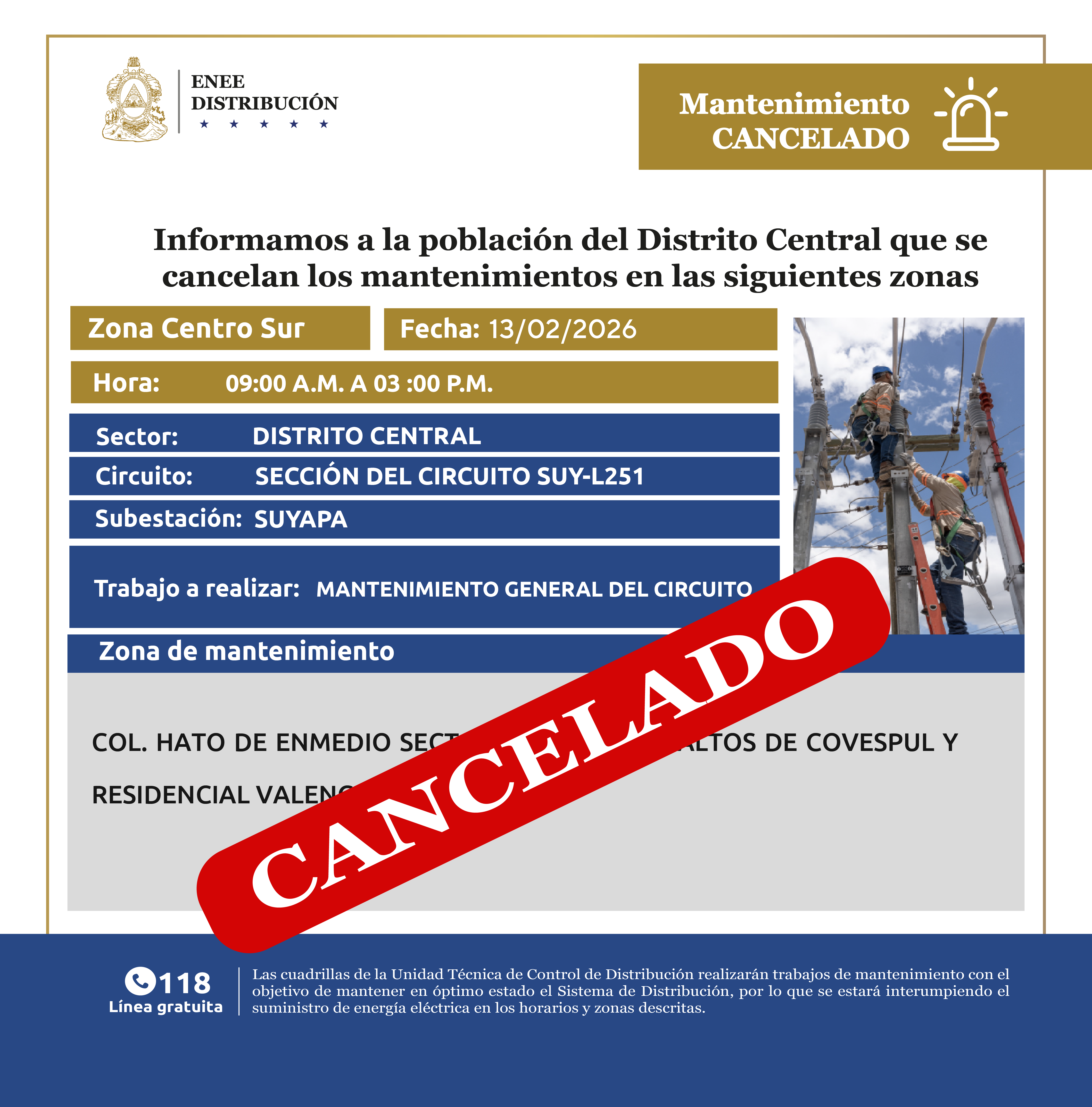 Aviso de Mantenimiento Cancelado- Centro Sur Distrito Central viernes 13 de febrero de 2026