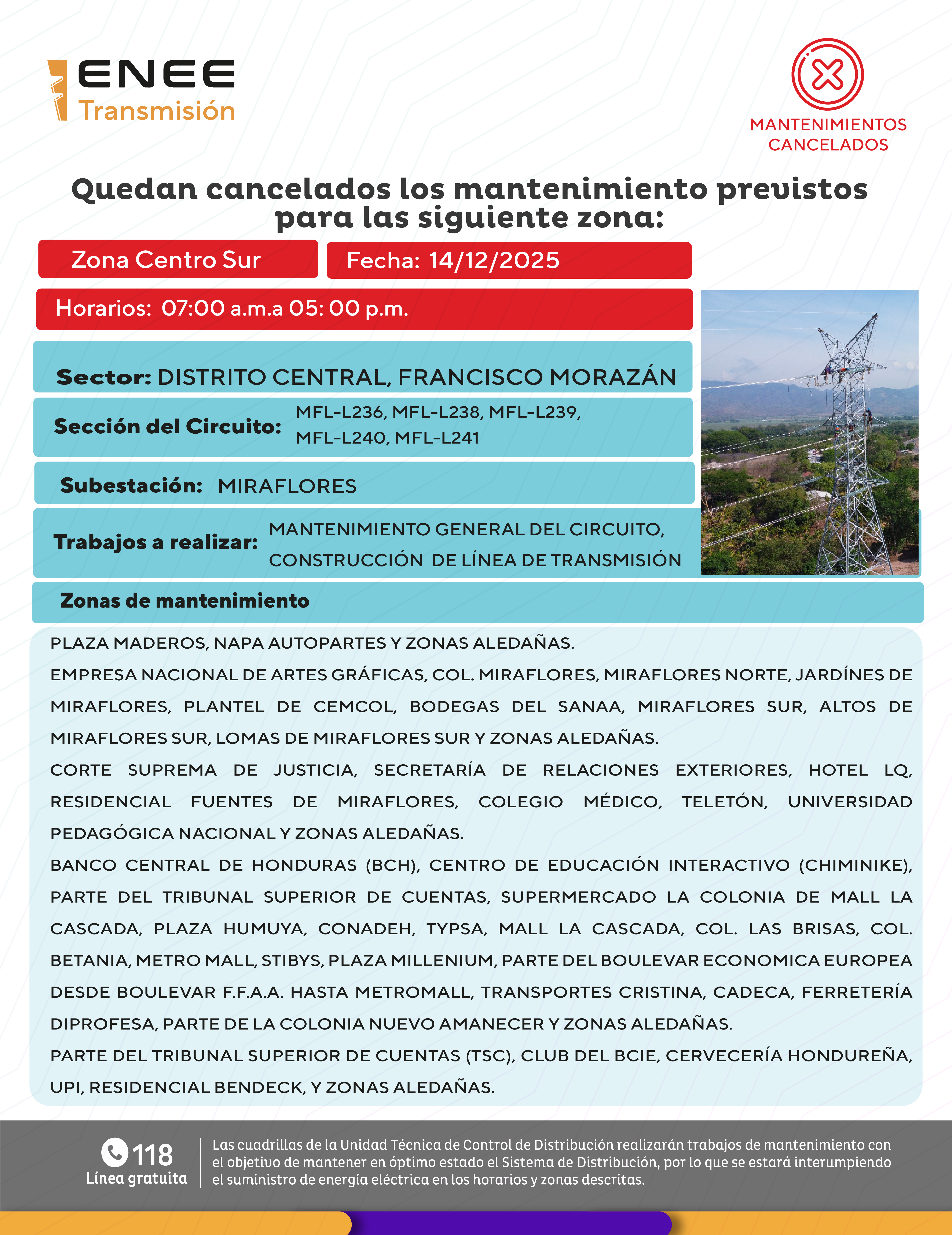 Avisos de Mantenimiento Cancelación - Centro Sur Distrito Central Comayagua 14 de diciembre de 2025