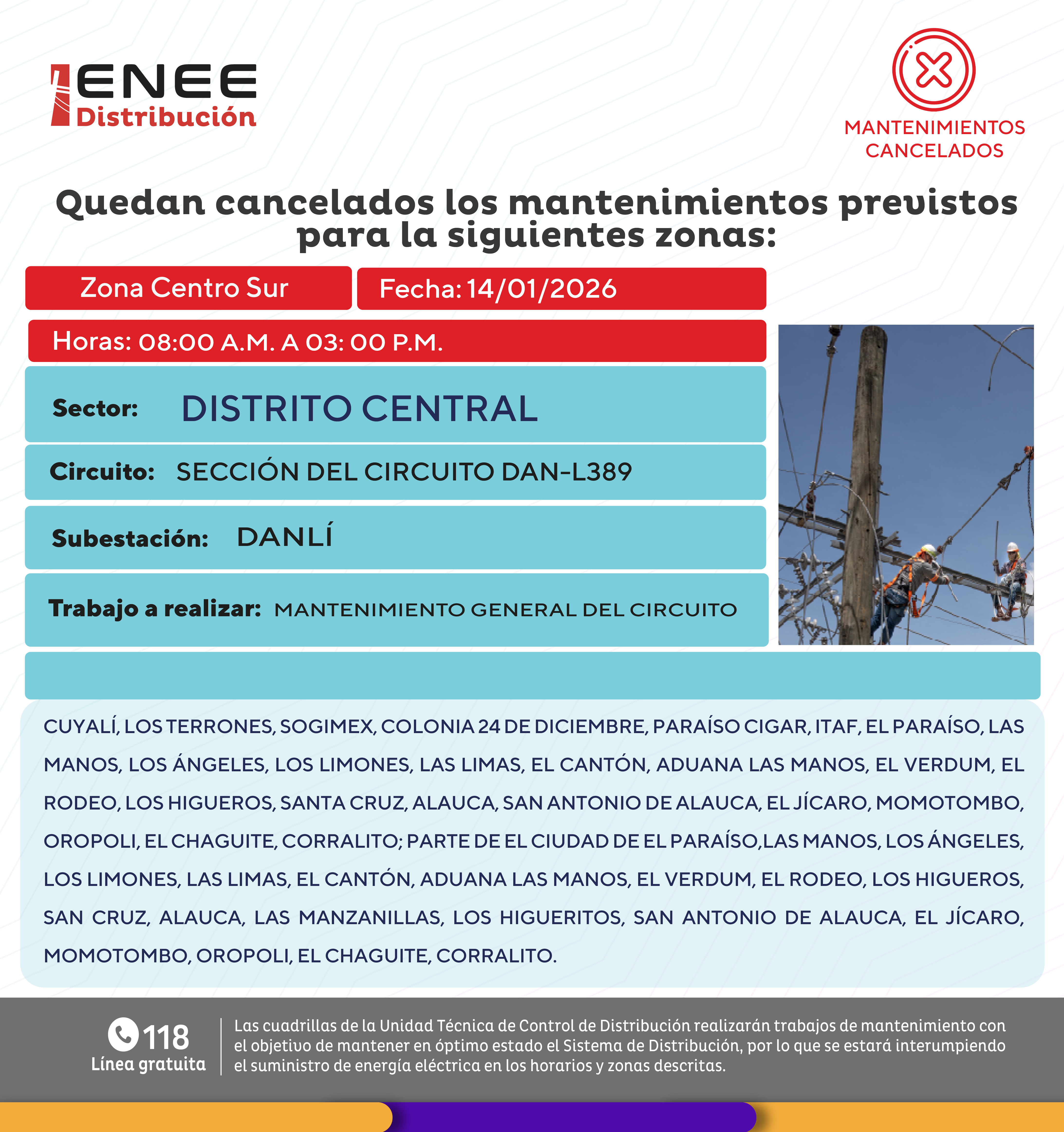 Avisos de Mantenimiento Cancelación - Centro Sur Distrito Central miércoles 14 de enero de 2026