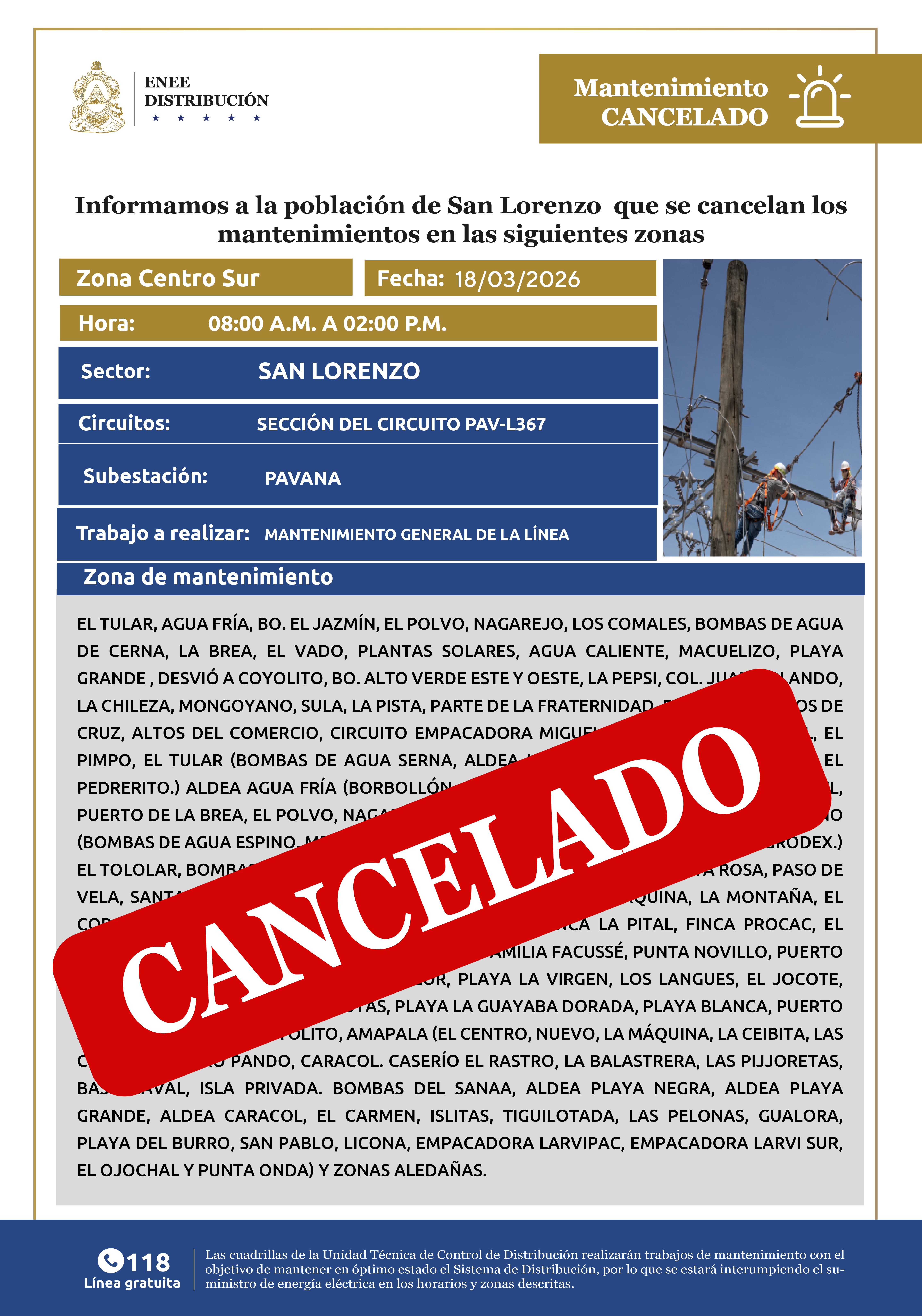 Avisos de Mantenimiento Cancelación - Centro Sur San Lorenzo miércoles 18 de marzo de 2026