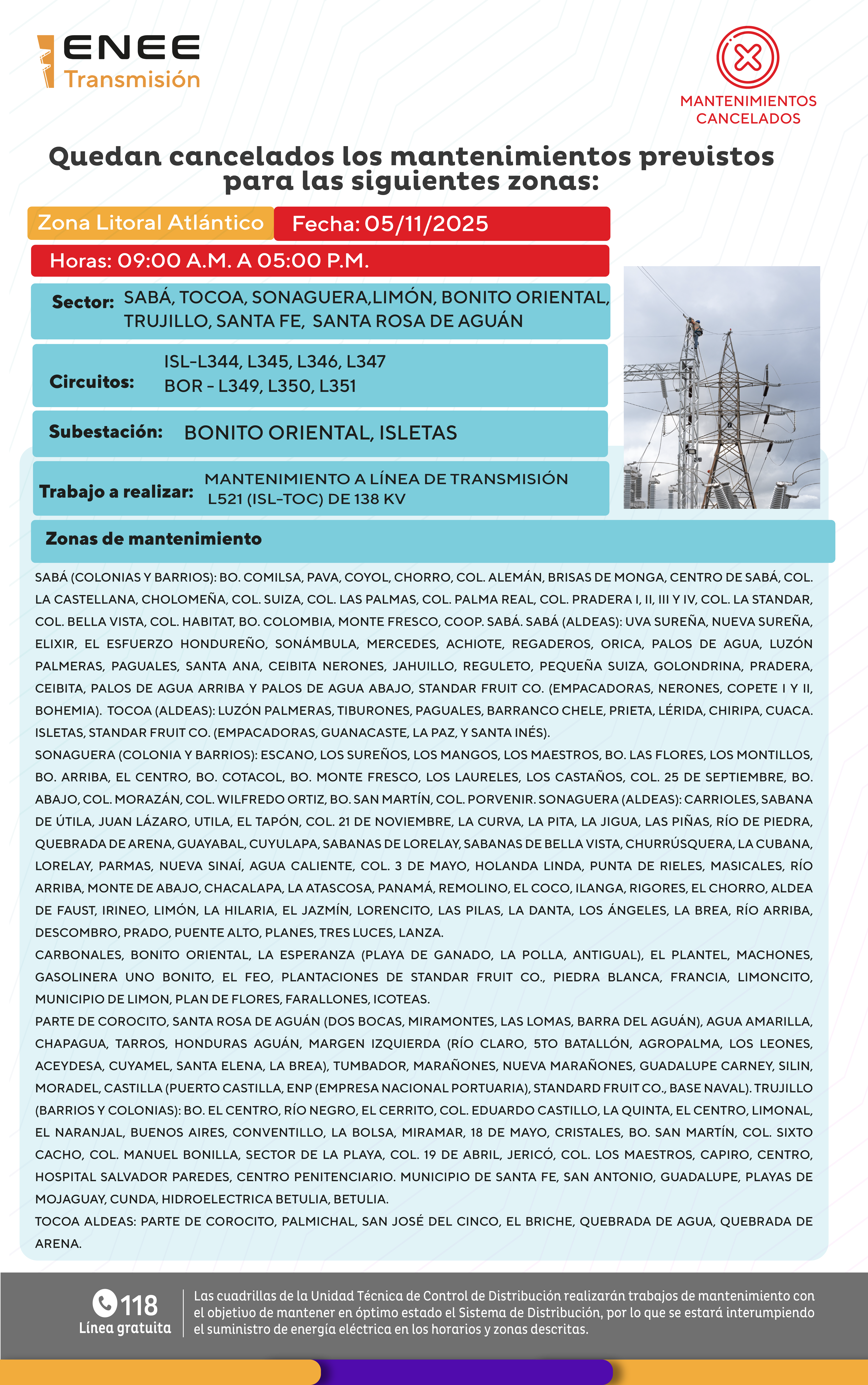 Avisos de Mantenimiento Cancelación - Litoral Atlántico Colón miércoles 05 noviembre de 2025