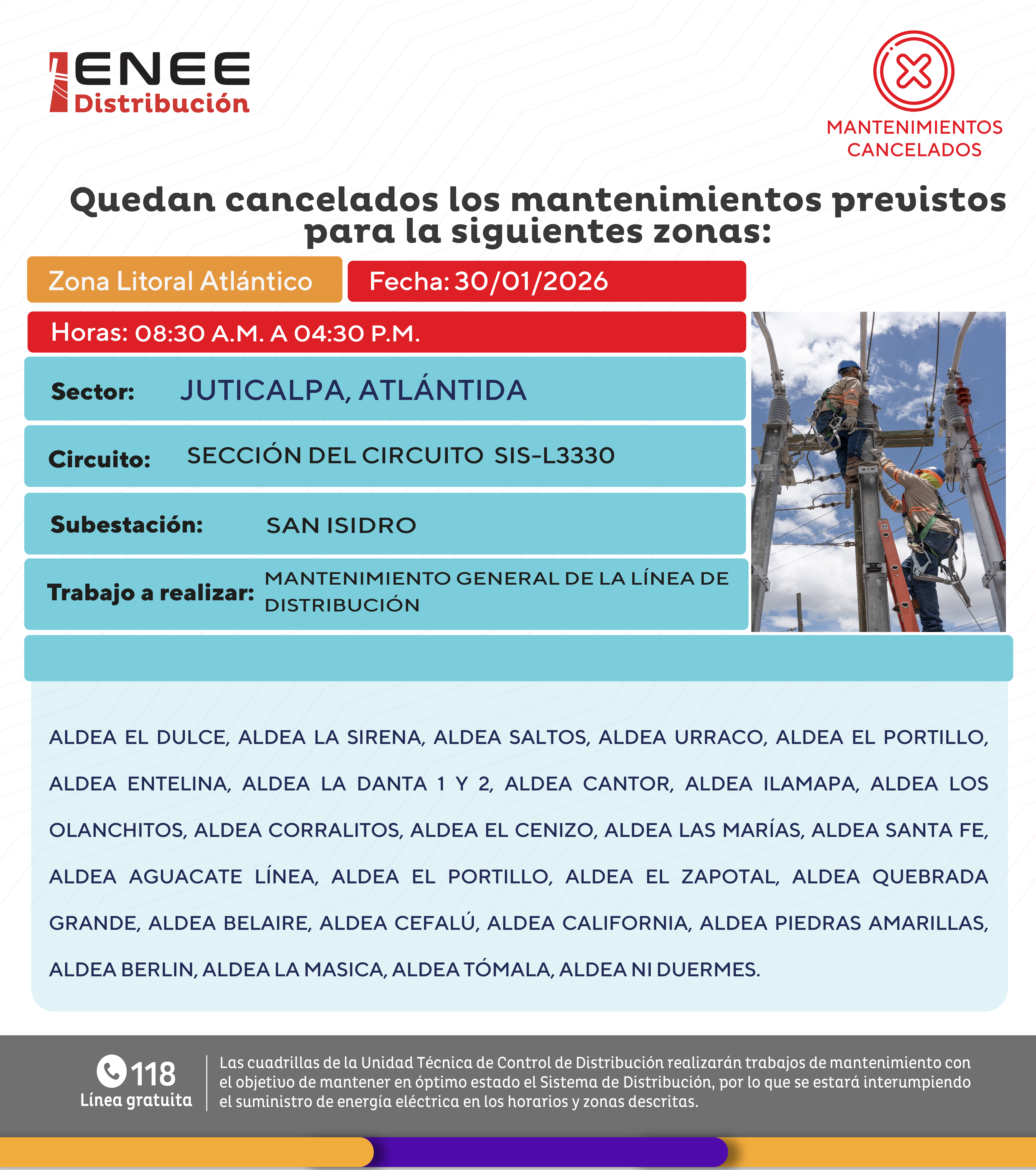 Avisos de Mantenimiento Cancelación- Litoral Atlántico Juticalpa viernes 30 de enero de 2026