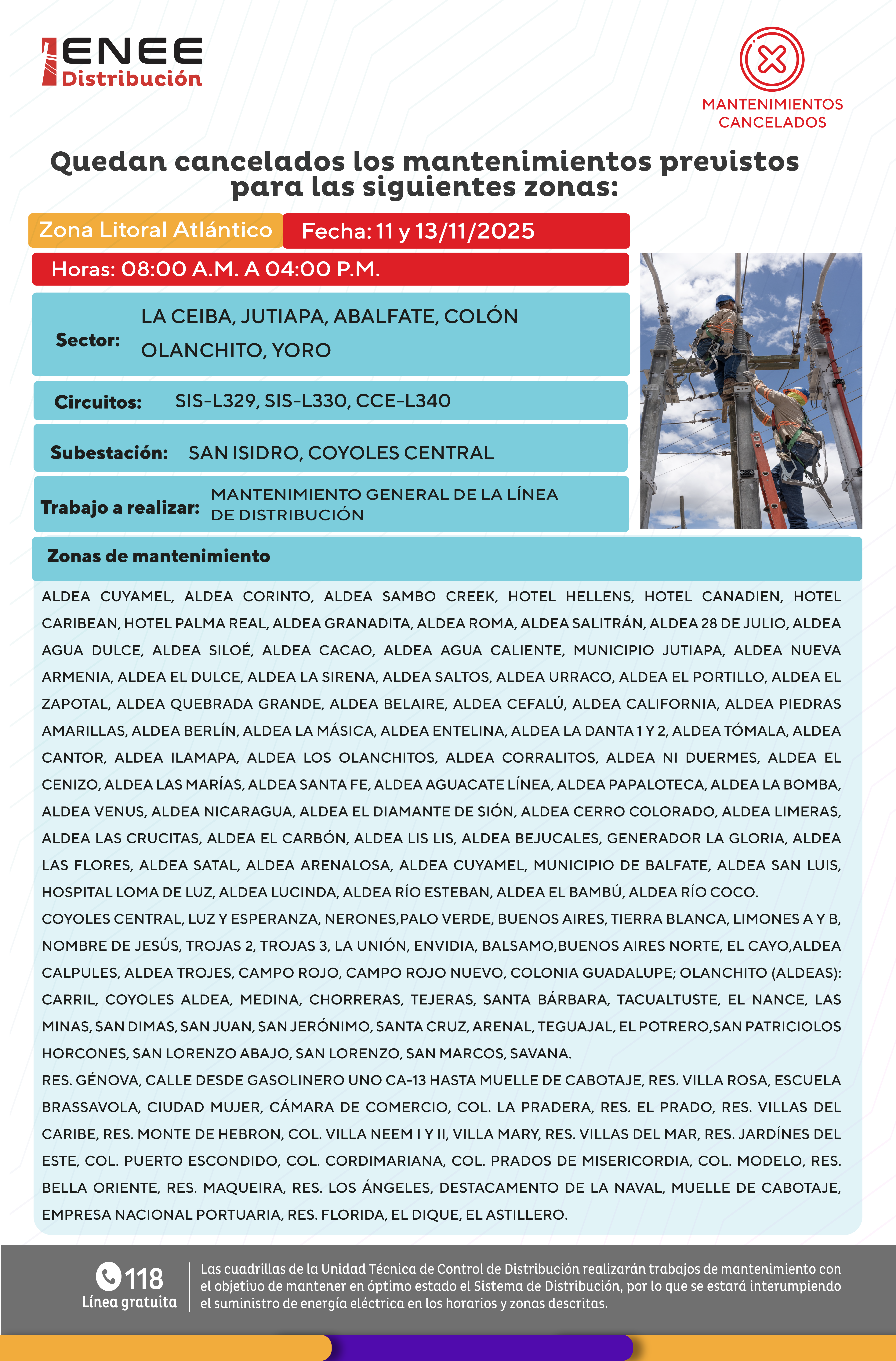 Avisos de Mantenimiento Cancelación - Litoral Atlántico martes 11 y jueves 13 noviembre de 2025