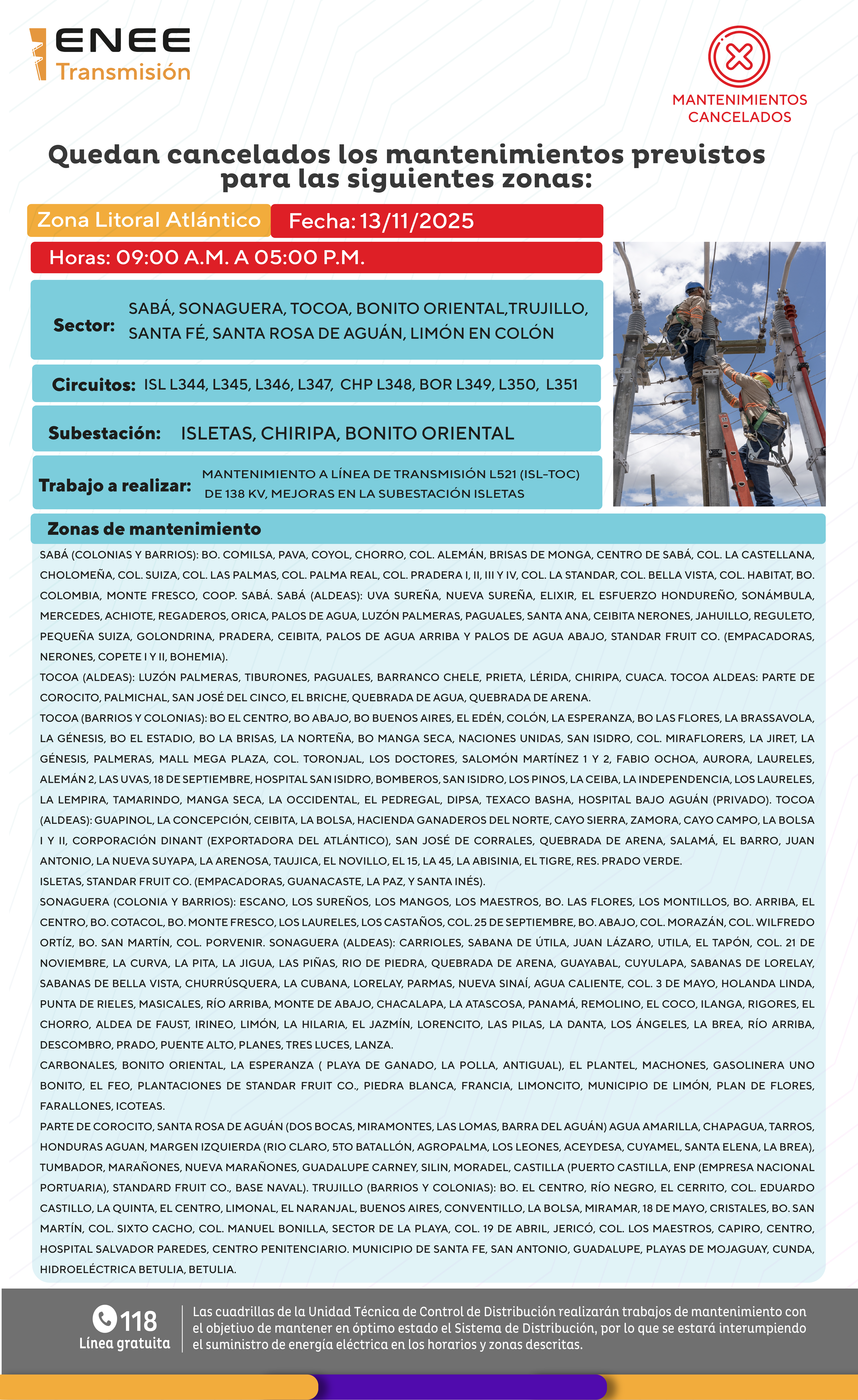 Avisos de Mantenimiento Cancelación - Litoral Atlántico Tocoa jueves 13 noviembre de 2025