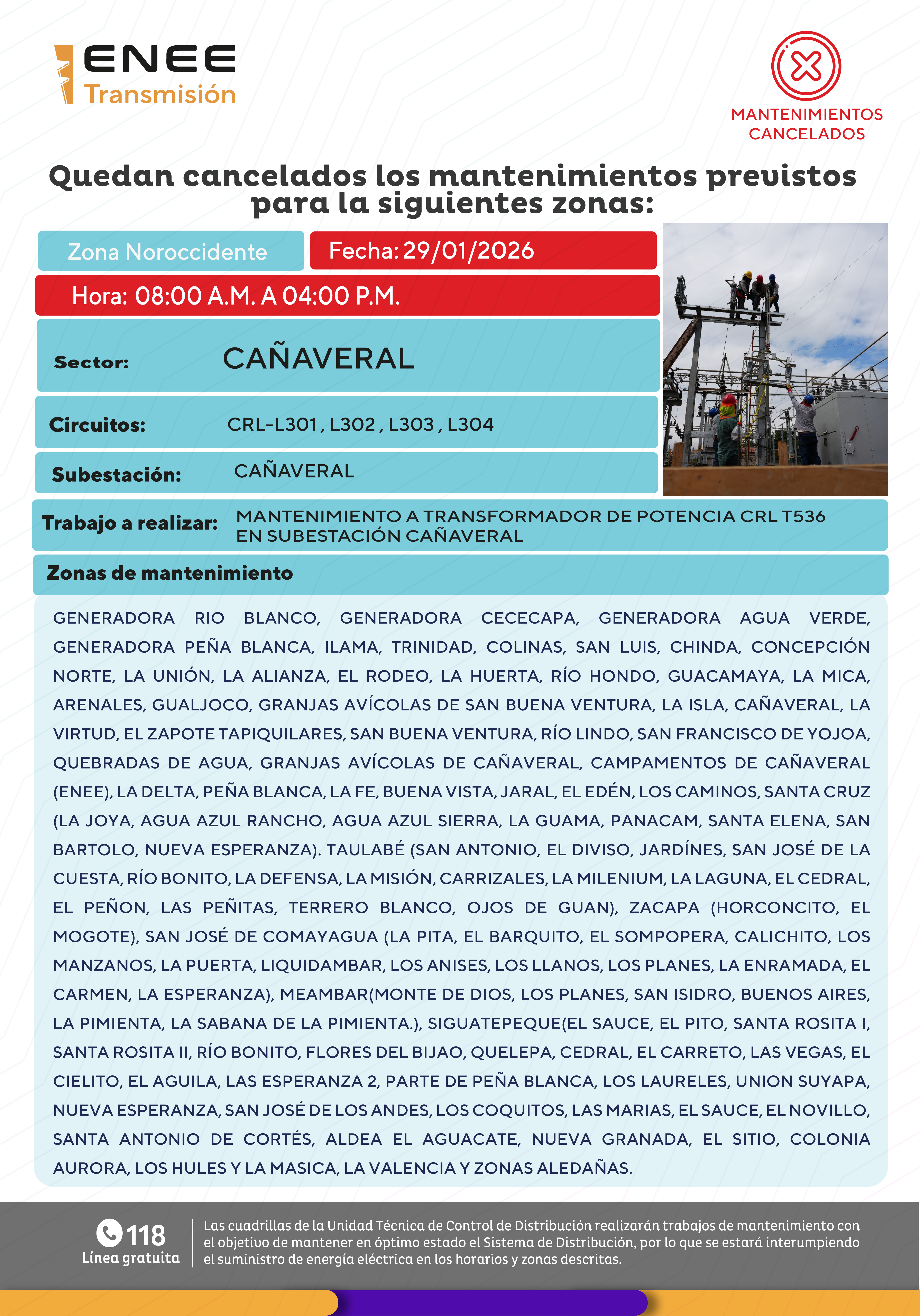 Avisos de Mantenimiento Cancelación- Noroccidente Cañaveral jueves 29 de enero de 2026