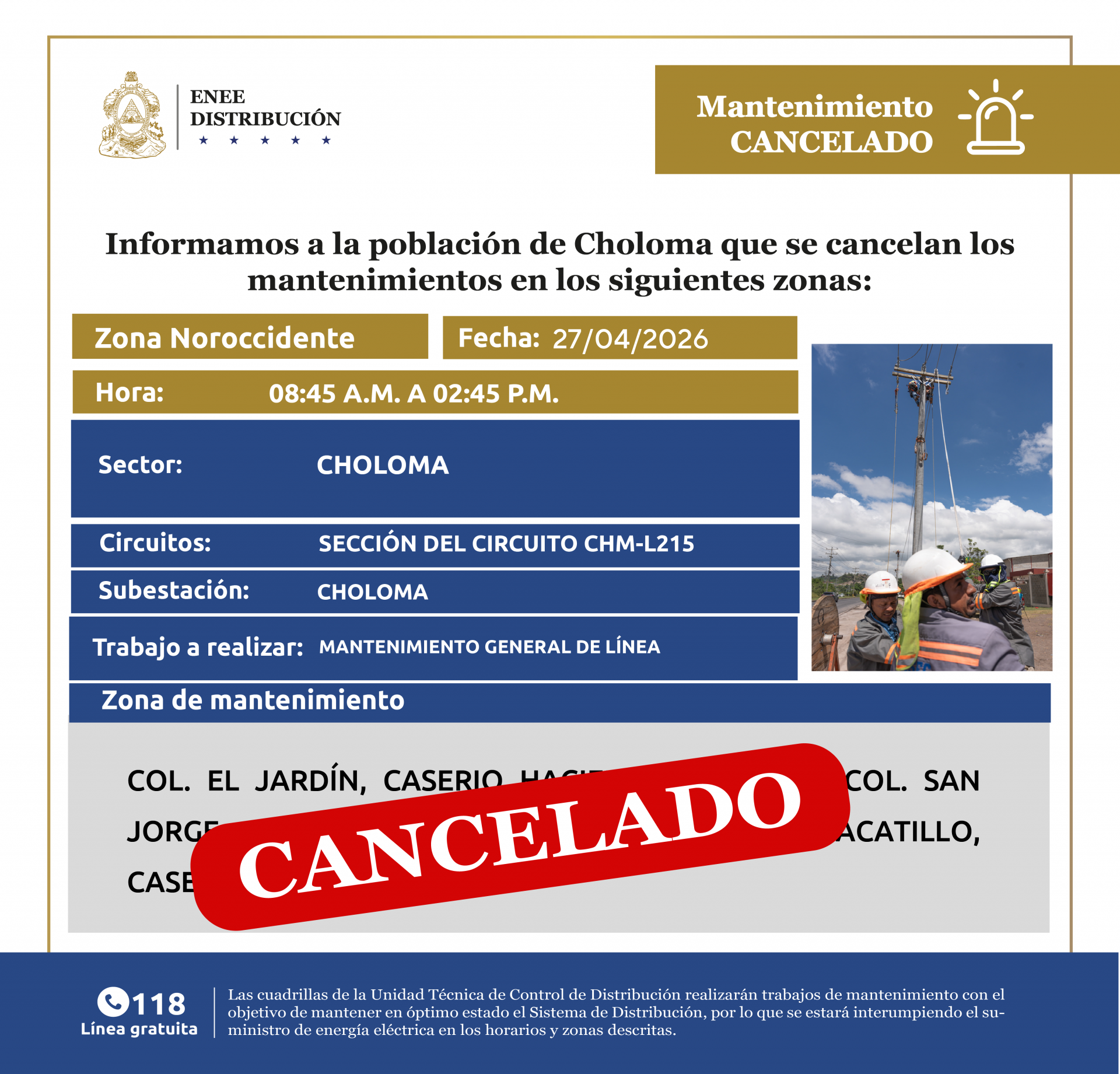 Avisos de Mantenimiento Cancelación - Noroccidente Choloma lunes 27 de abril de 2026