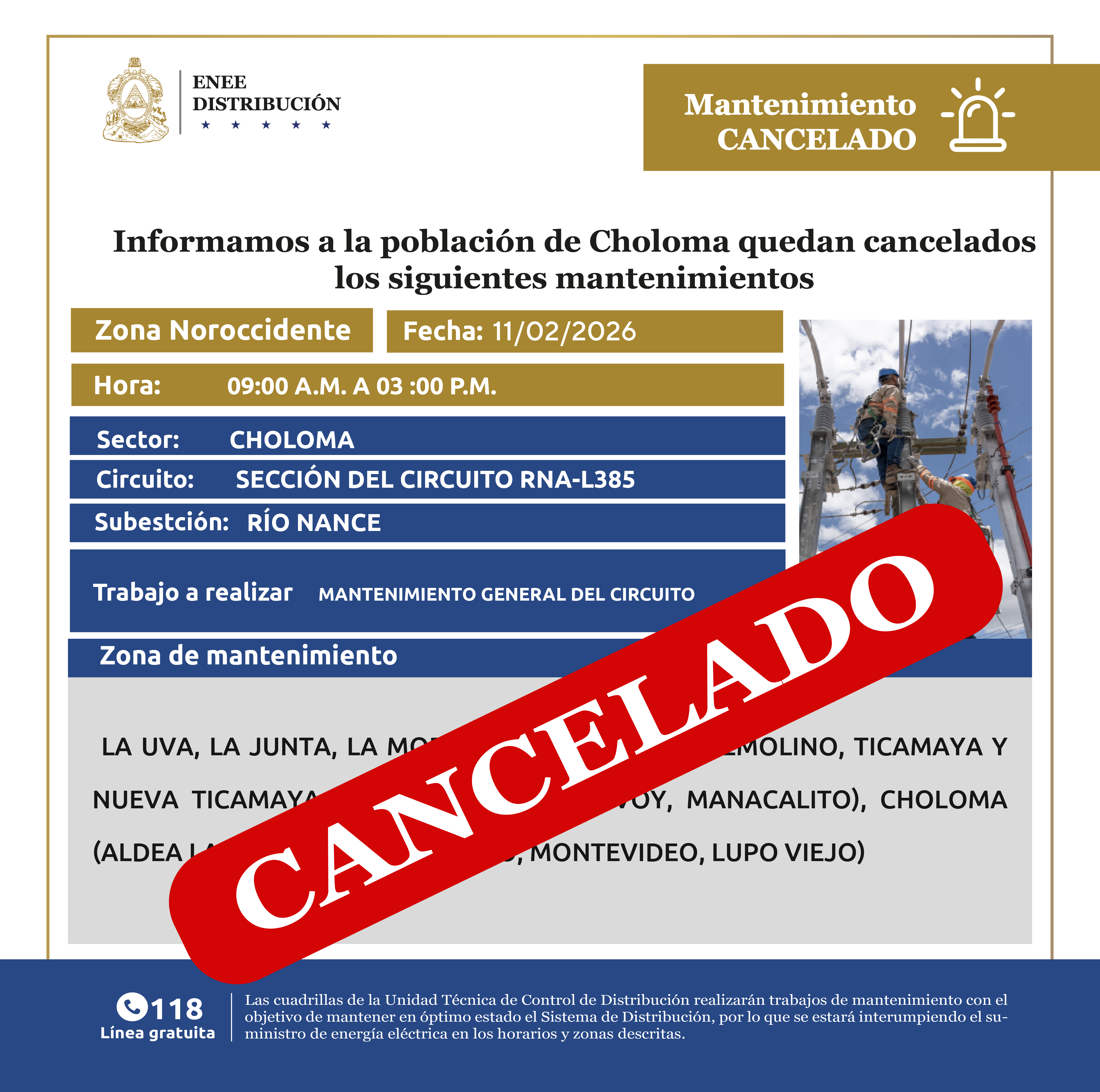 Avisos de Mantenimiento Cancelación- Noroccidente Choloma miércoles 11 de febrero de 2026