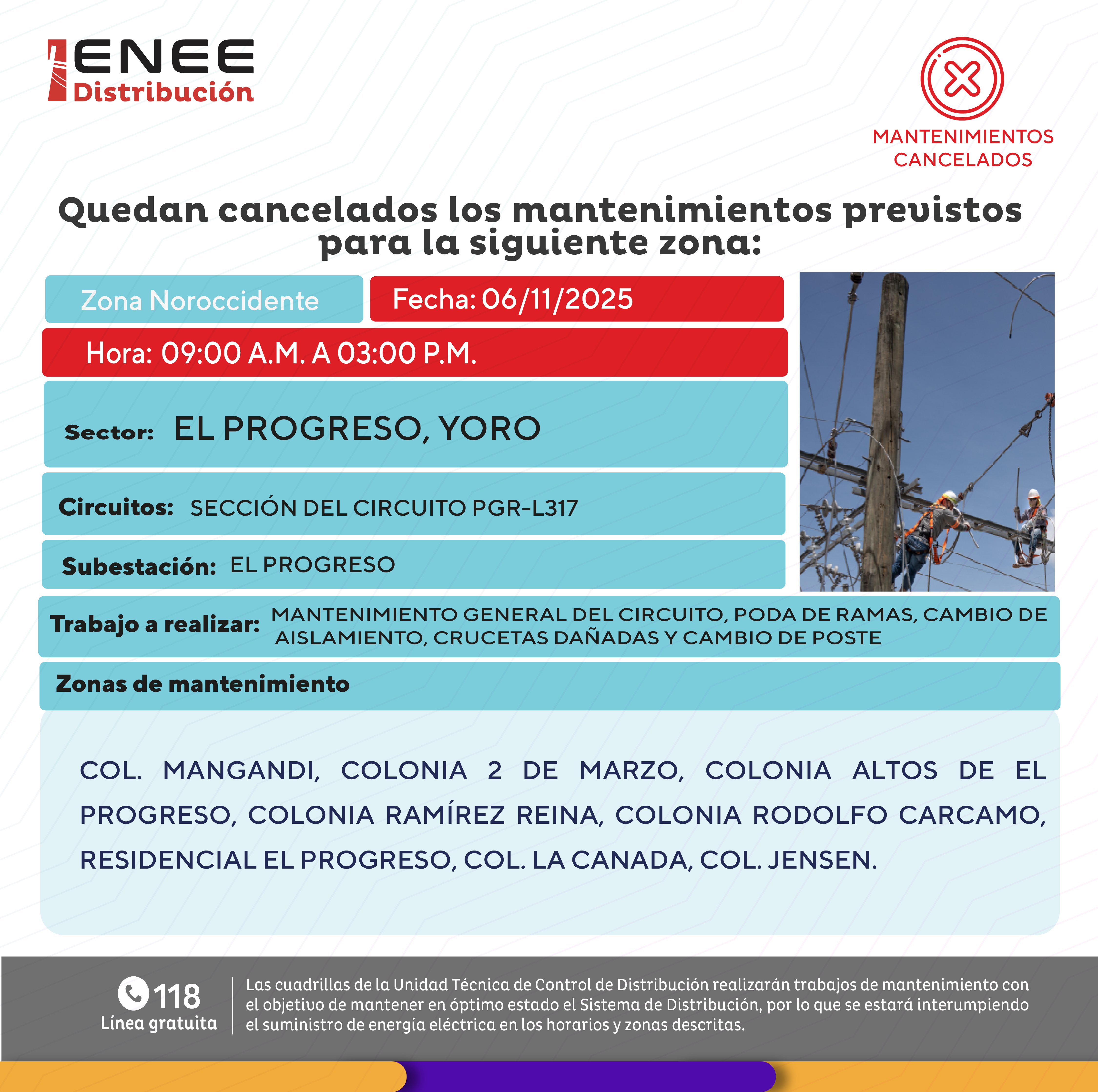 Avisos de Mantenimiento Cancelación - Noroccidente El Progreso jueves 06 noviembre de 2025