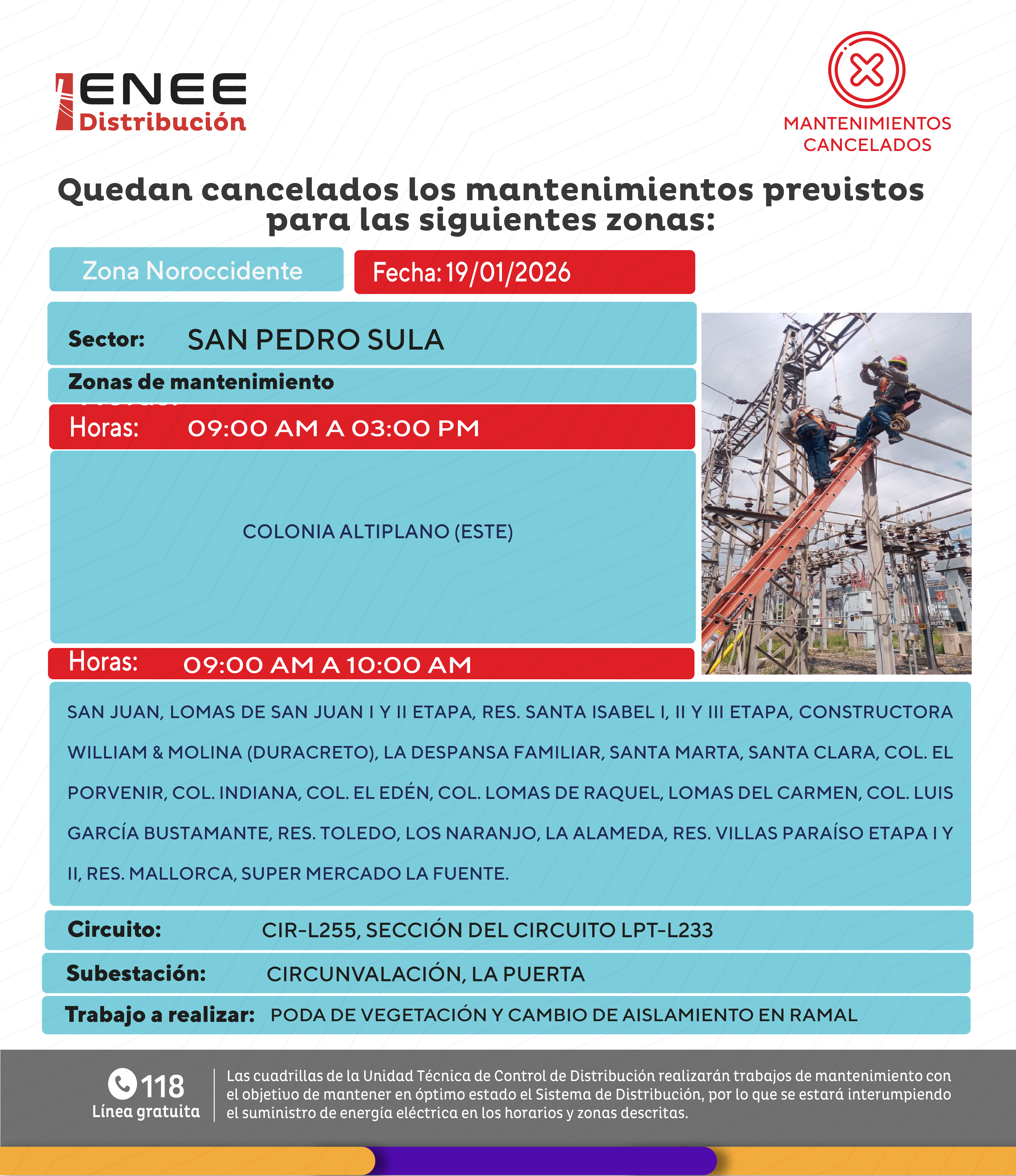 Avisos de Mantenimiento Cancelación - Noroccidente San Pedro Sula lunes 19 de enero de 2026
