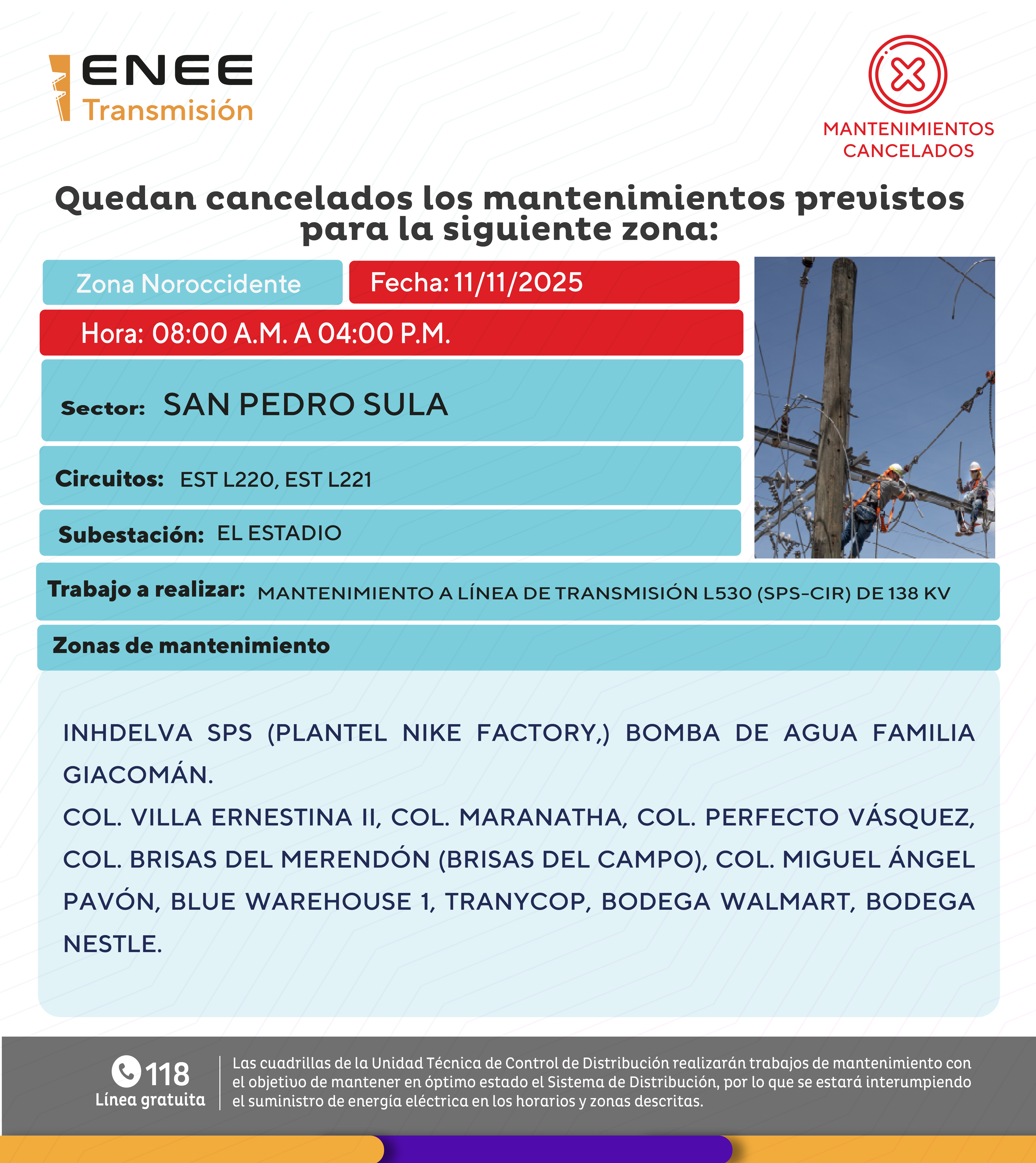 Avisos de Mantenimiento Cancelación - Noroccidente San Pedro Sula martes 11 noviembre de 2025