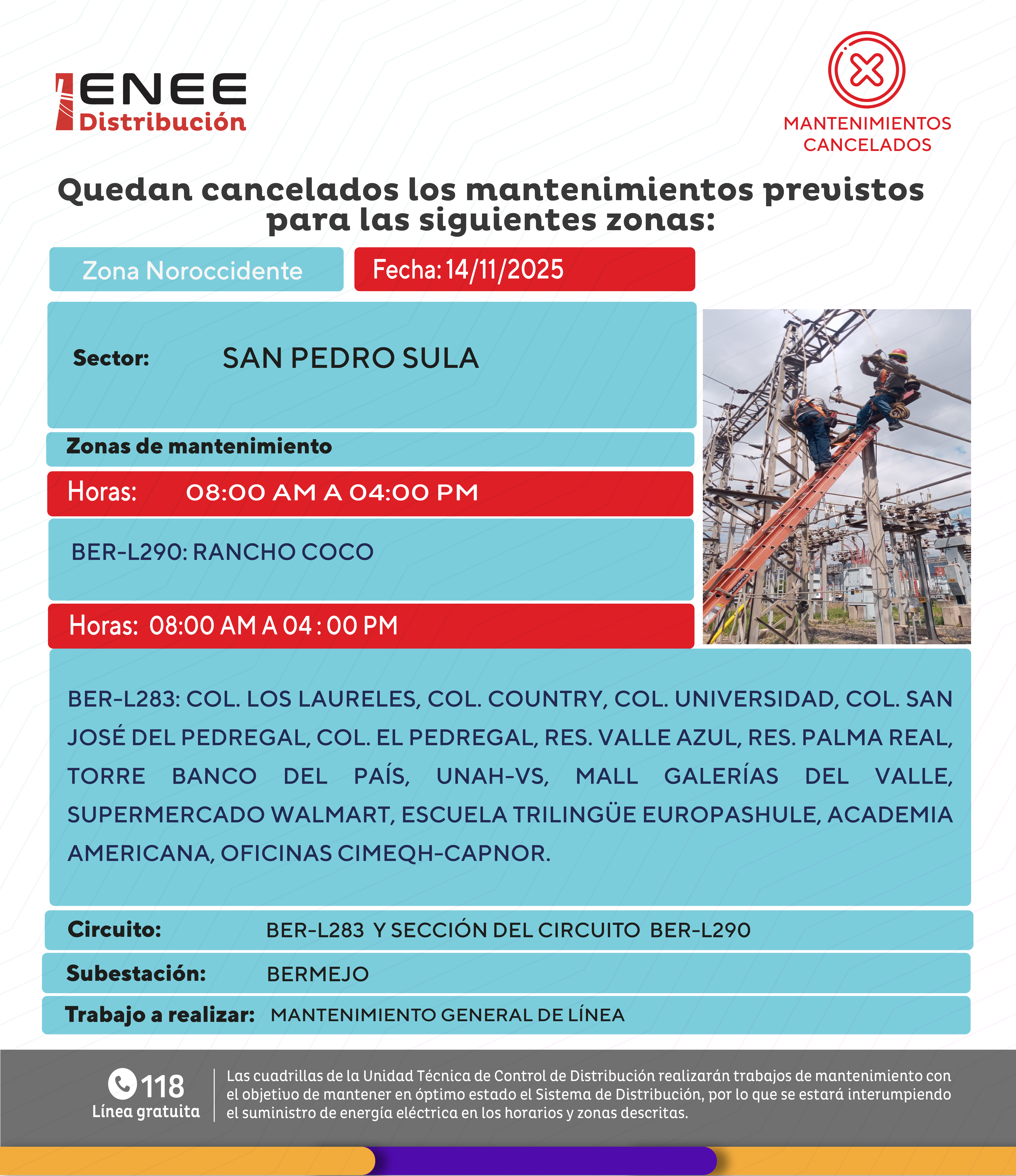 Avisos de Mantenimiento Cancelación - Noroccidente San Pedro Sula viernes 14 noviembre de 2025
