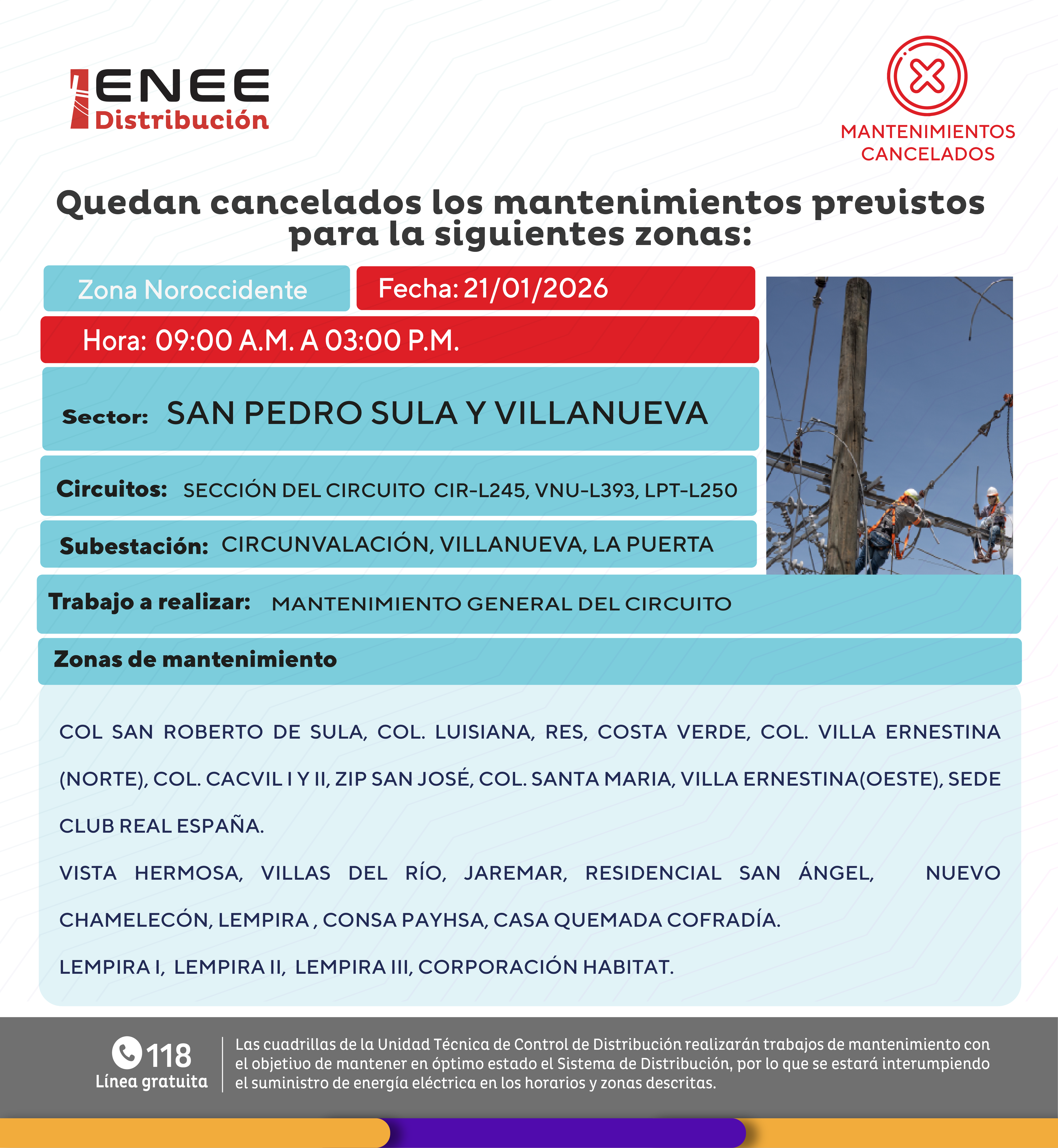 Avisos de Mantenimiento Cancelación - Noroccidente San Pedro Sula y Villanueva miércoles 21 de enero de 2026
