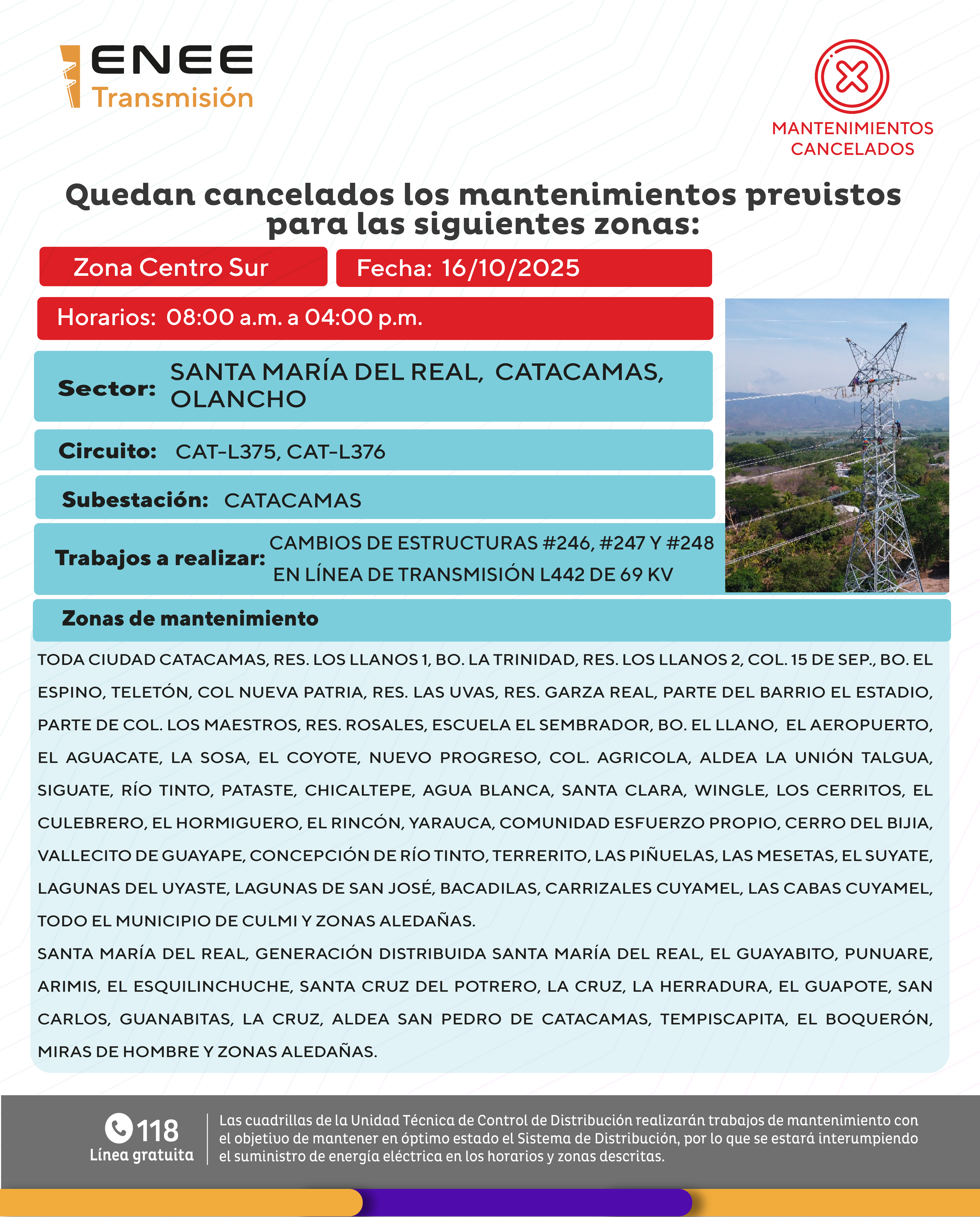 Avisos de Mantenimiento Cancelación - Zona Centro Sur Catacamas, Olancho jueves 16 de octubre de 2025