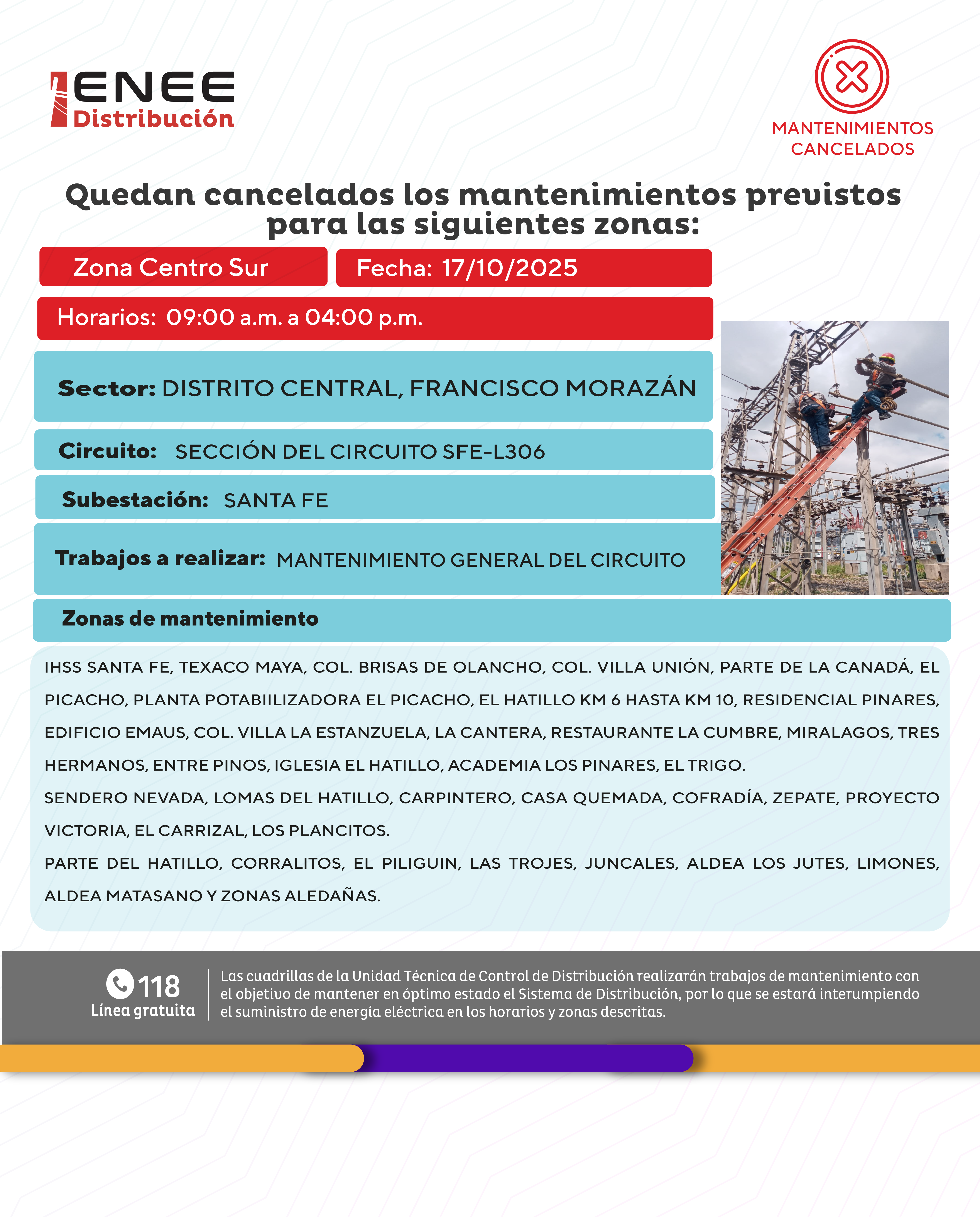 Avisos de Mantenimiento Cancelación - Zona Centro Sur Distrito Central viernes 17 de octubre de 2025