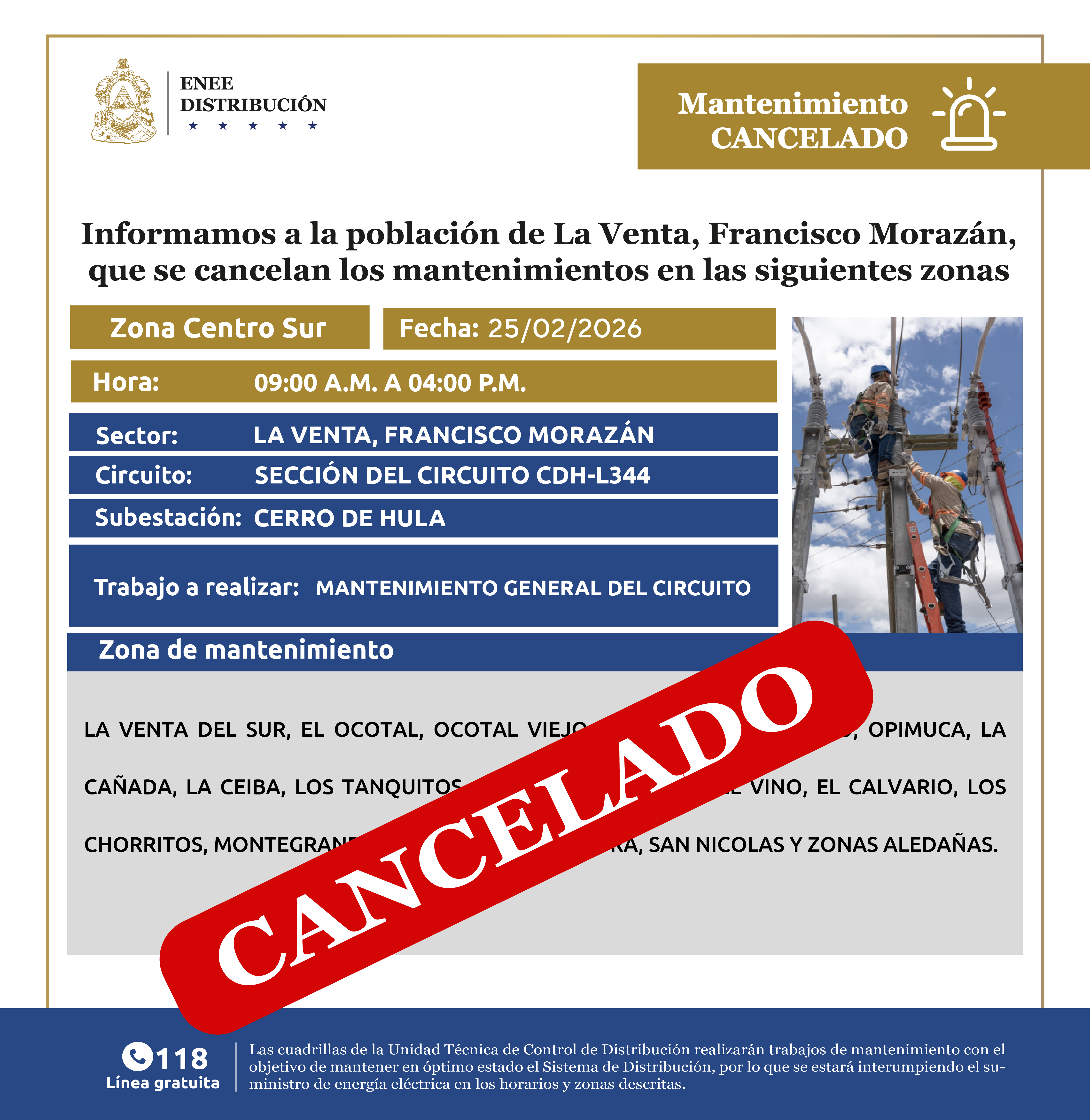 Avisos de Mantenimiento Cancelación - Zona Centro Sur La Venta, Francisco Morazán miércoles 25 de febrero de 2026