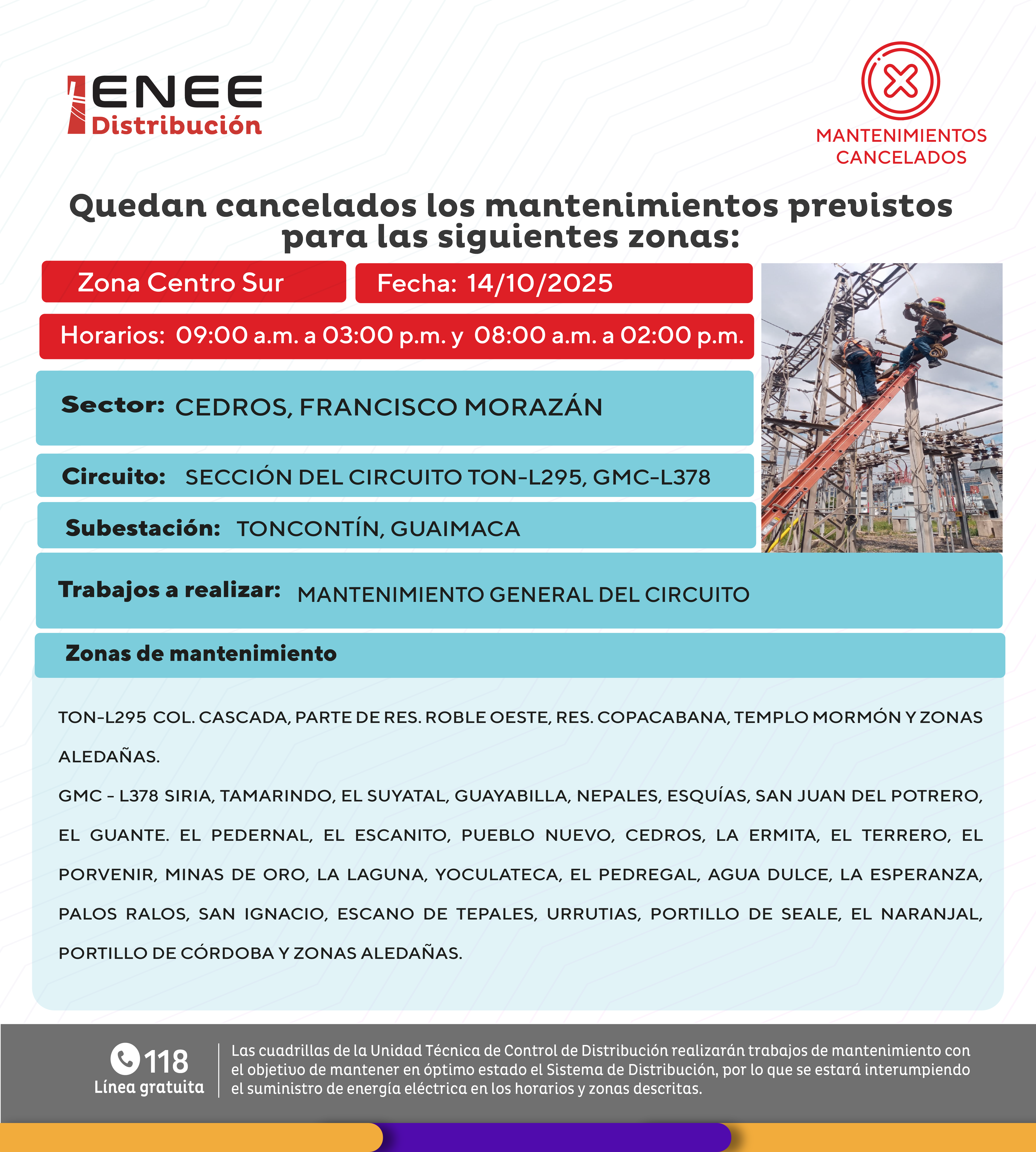 Avisos de Mantenimiento Cancelación - Zona Centro Sur Toncontín y Cedros F.M. martes 14 de octubre de 2025