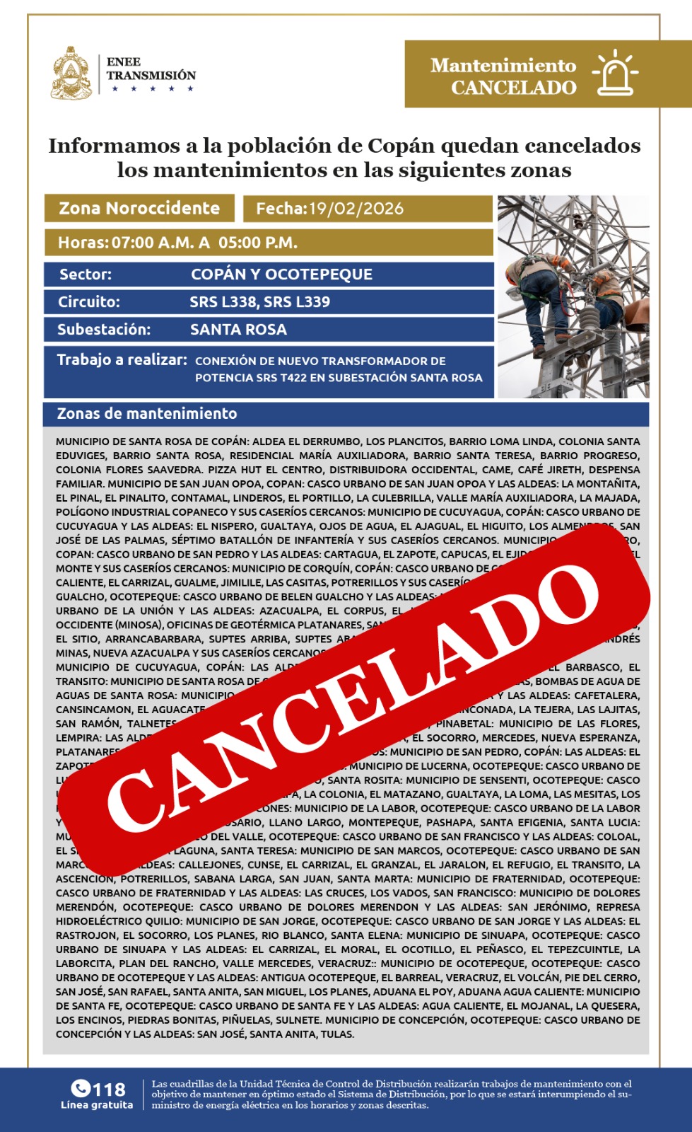 Avisos de Mantenimiento Cancelación - Zona Noroccidente Copán y Ocotepeque jueves 19 de febrero de 2026
