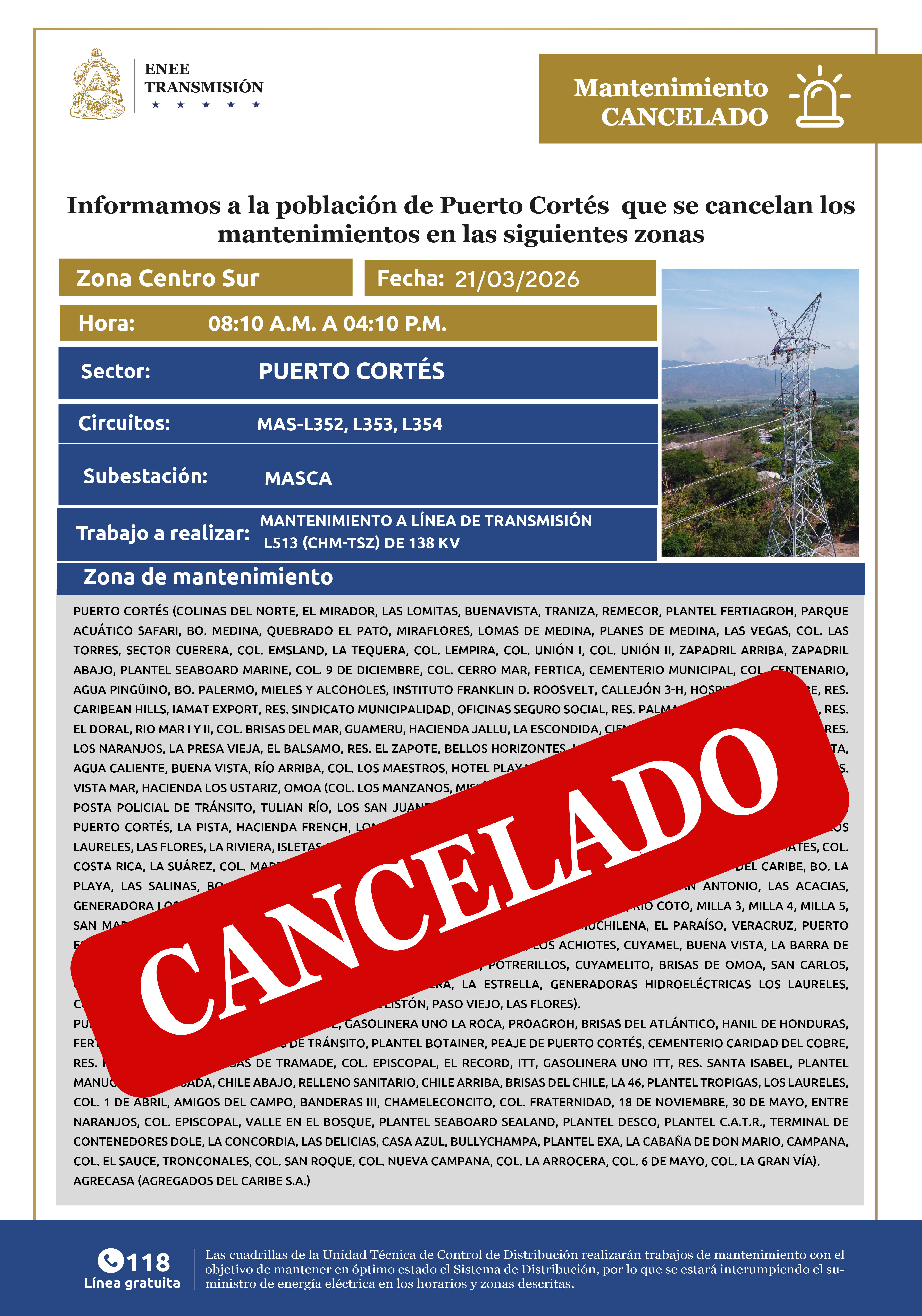 Avisos de Mantenimiento cancelación - Zona Noroccidente Puerto Cortés sábado 21 de marzo de 2026