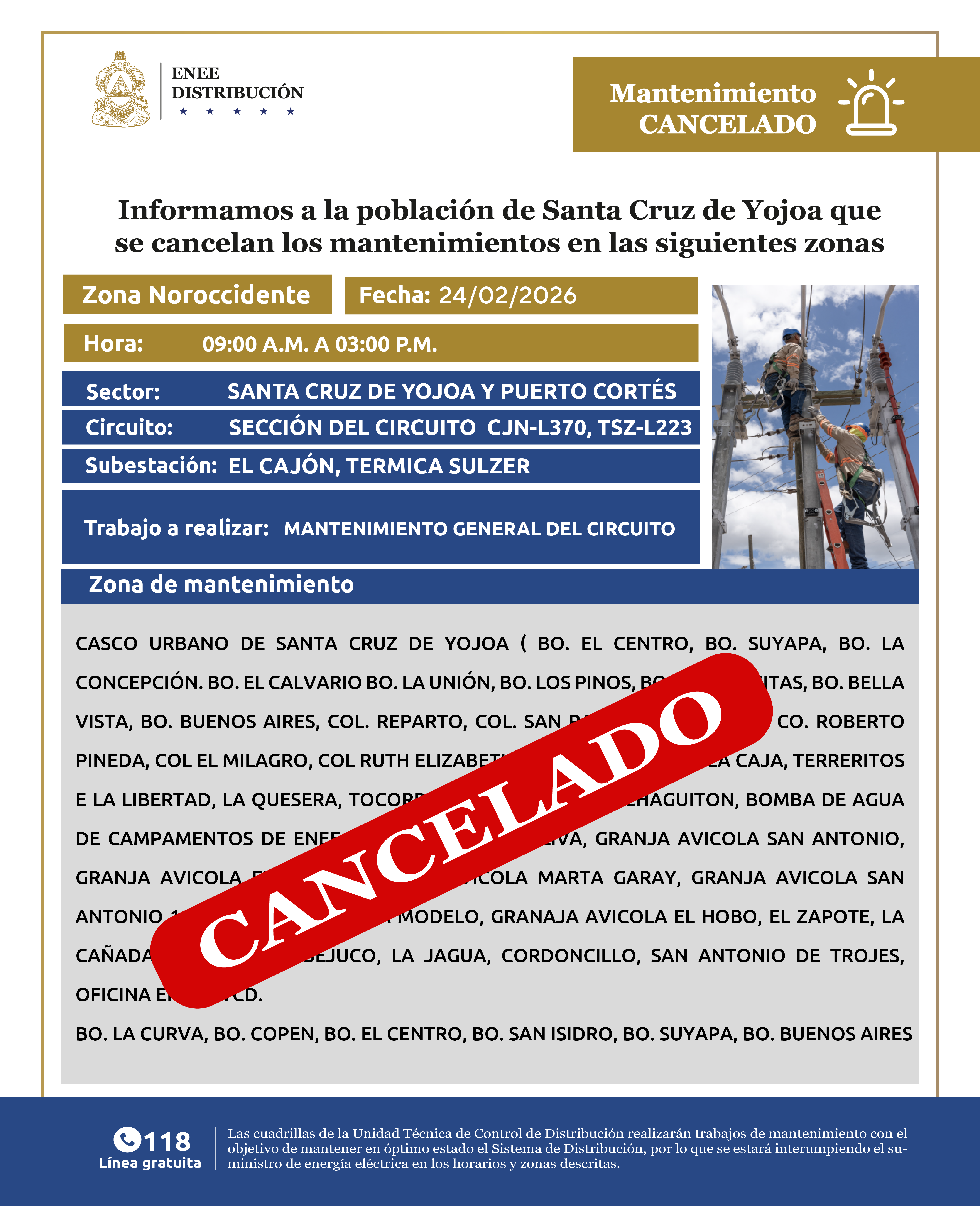 Avisos de Mantenimiento Cancelación - Zona Noroccidente Santa Cruz de Yojoa y Puerto Cortés martes 24 de febrero de 2026