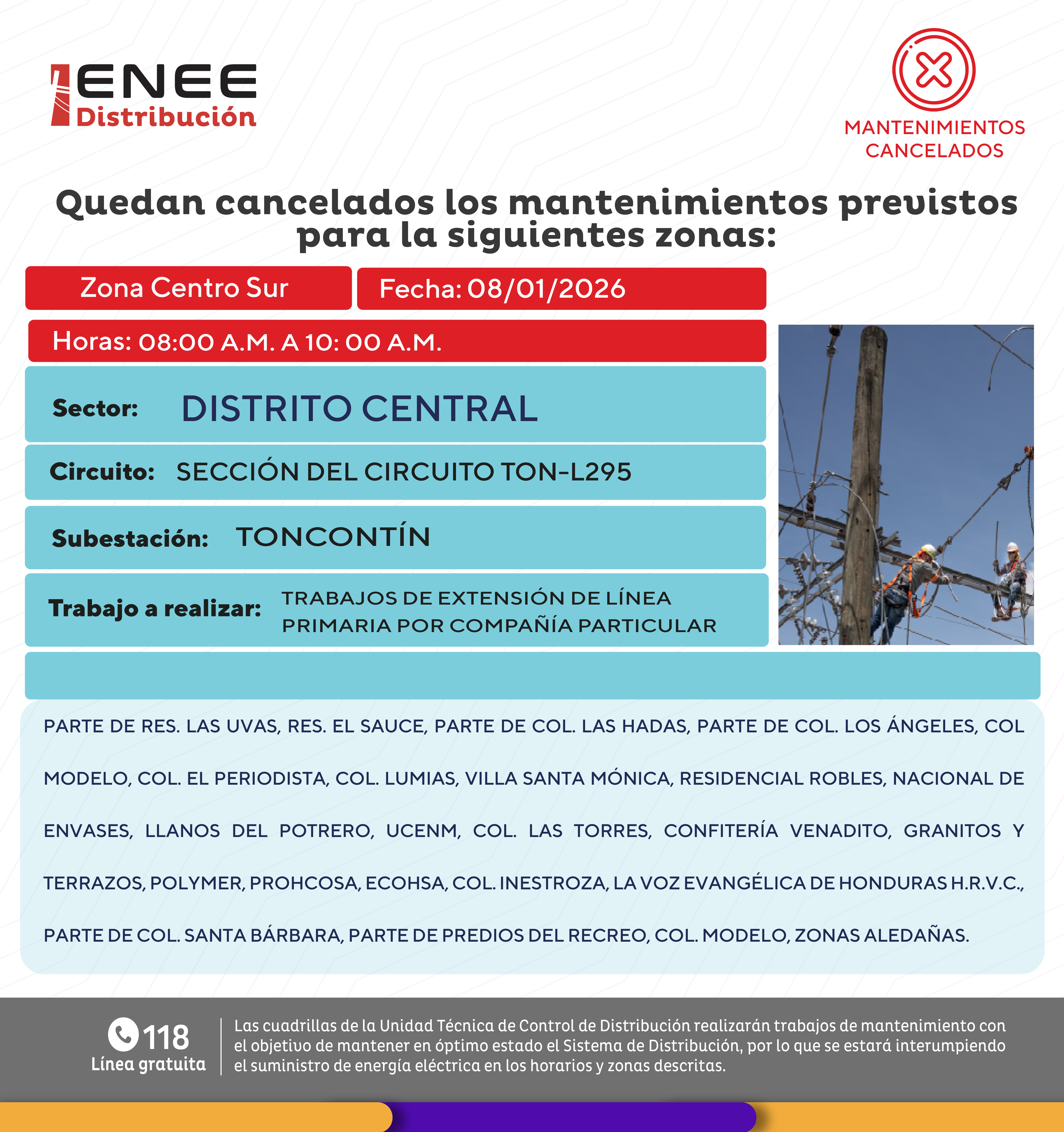 Avisos de Mantenimiento Cancelado - Centro Sur Distrito Central jueves 08 de enero de 2026