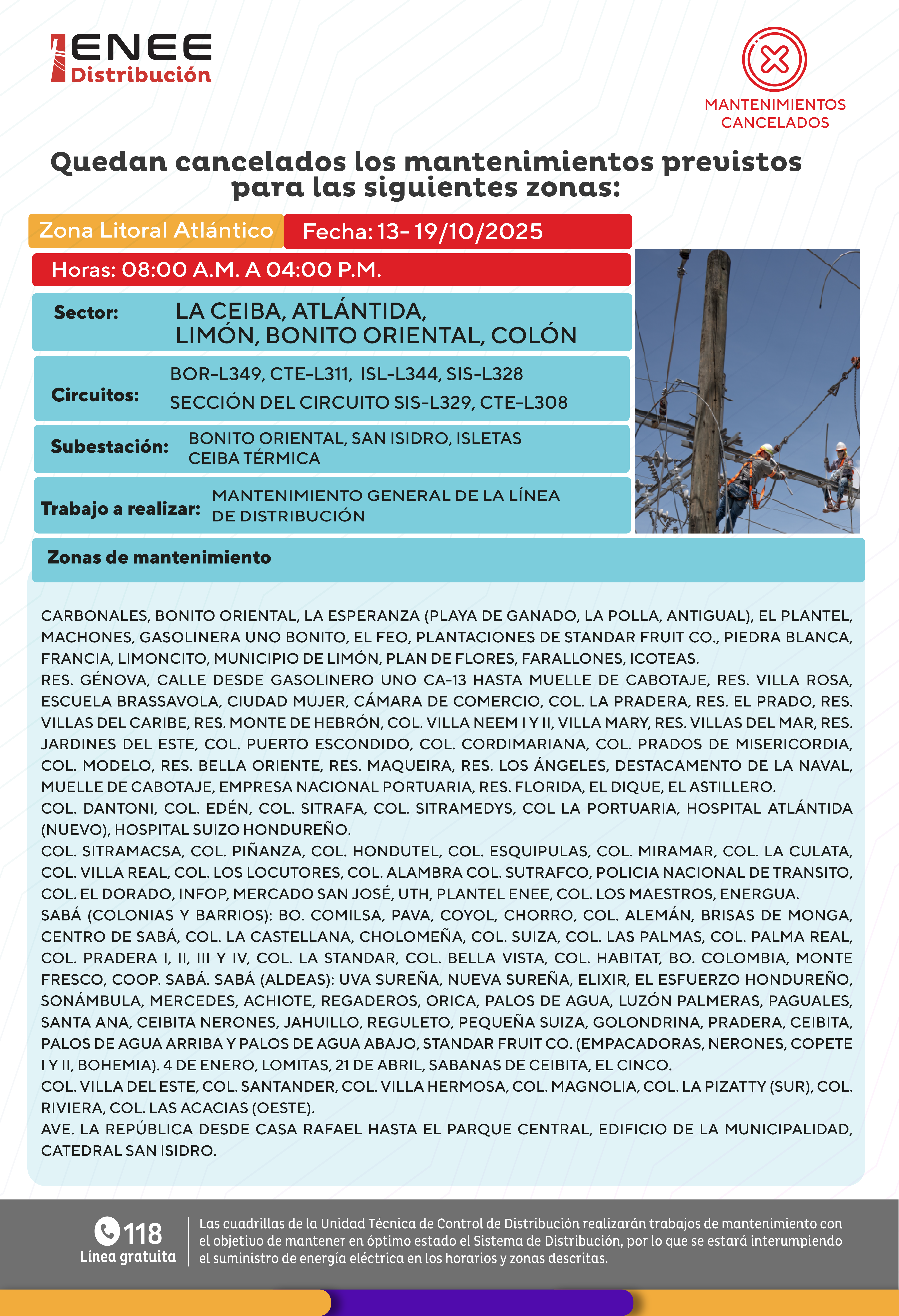 Avisos de Mantenimiento Cancelado - Litoral Atlántico martes 14 al domingo 19 de octubre de 2025
