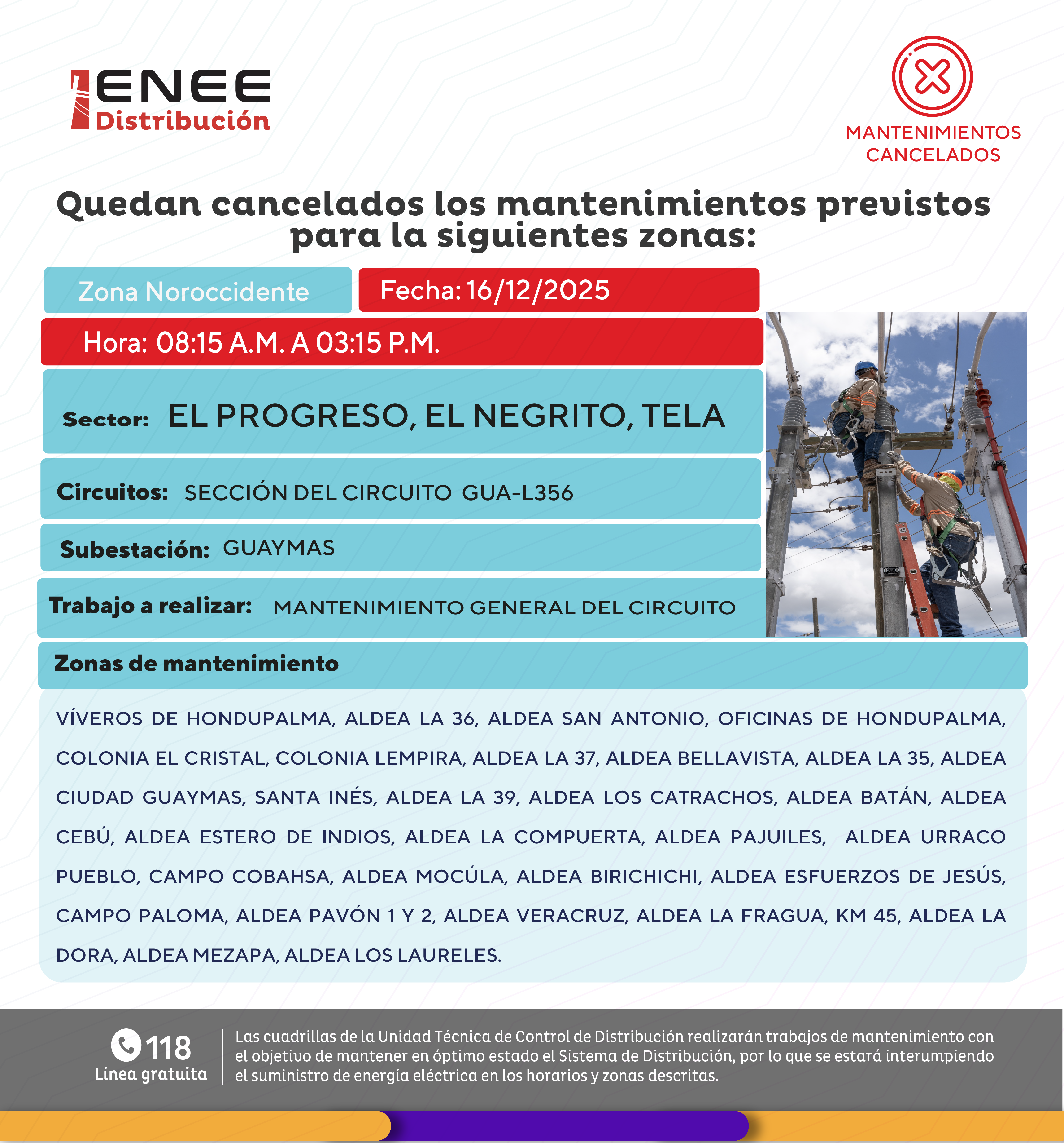 Avisos de Mantenimiento Cancelado - Noroccidente El Progreso, El Negrito, Tela martes 16 de diciembre de 2025