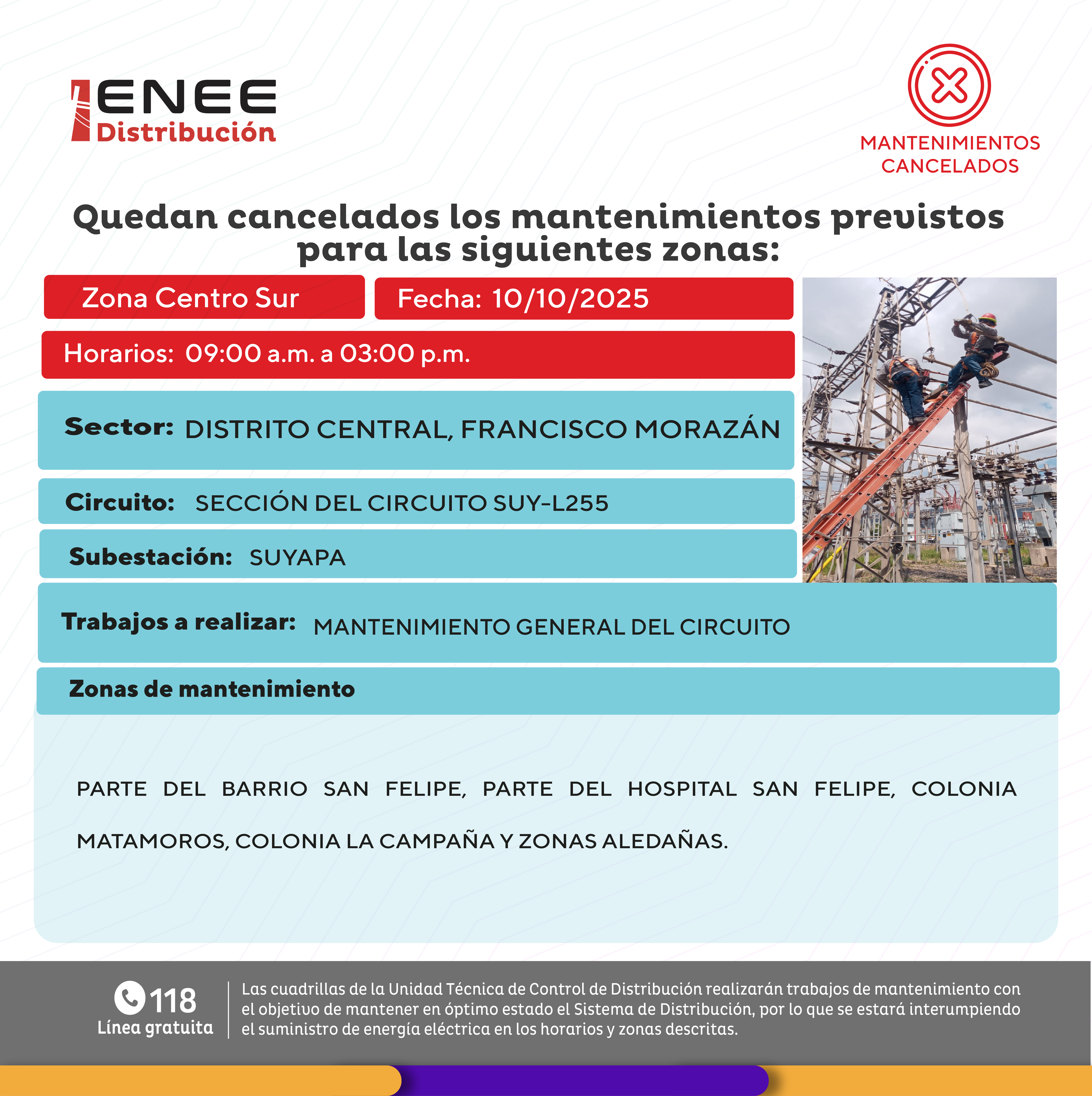 Avisos de Mantenimiento Cancelado - Zona Centro Sur Distrito Central viernes 10 de octubre de 2025