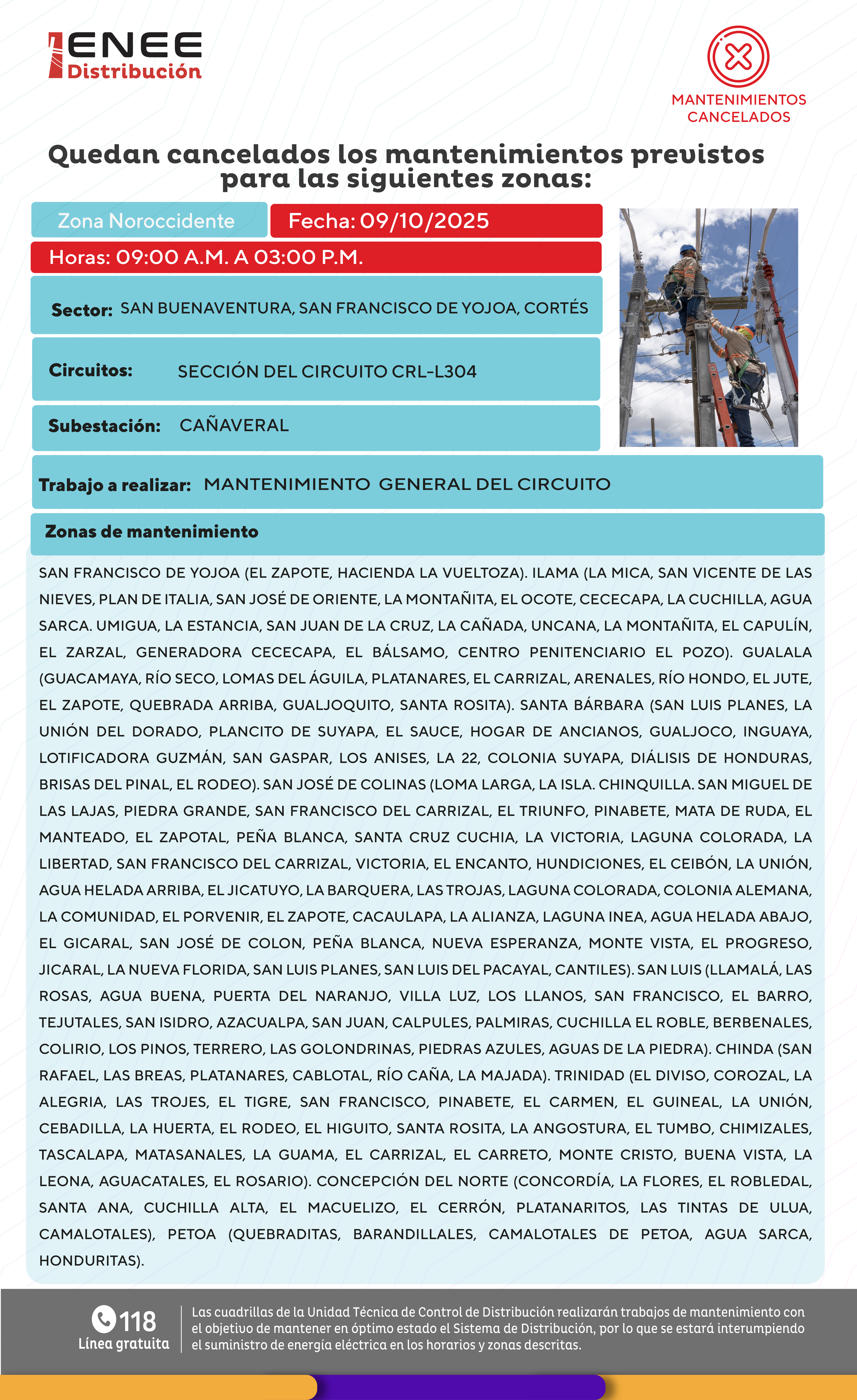 Avisos de Mantenimiento Cancelado - Zona Noroccidente San Francisco de Yojoa jueves 09 de octubre de 2025