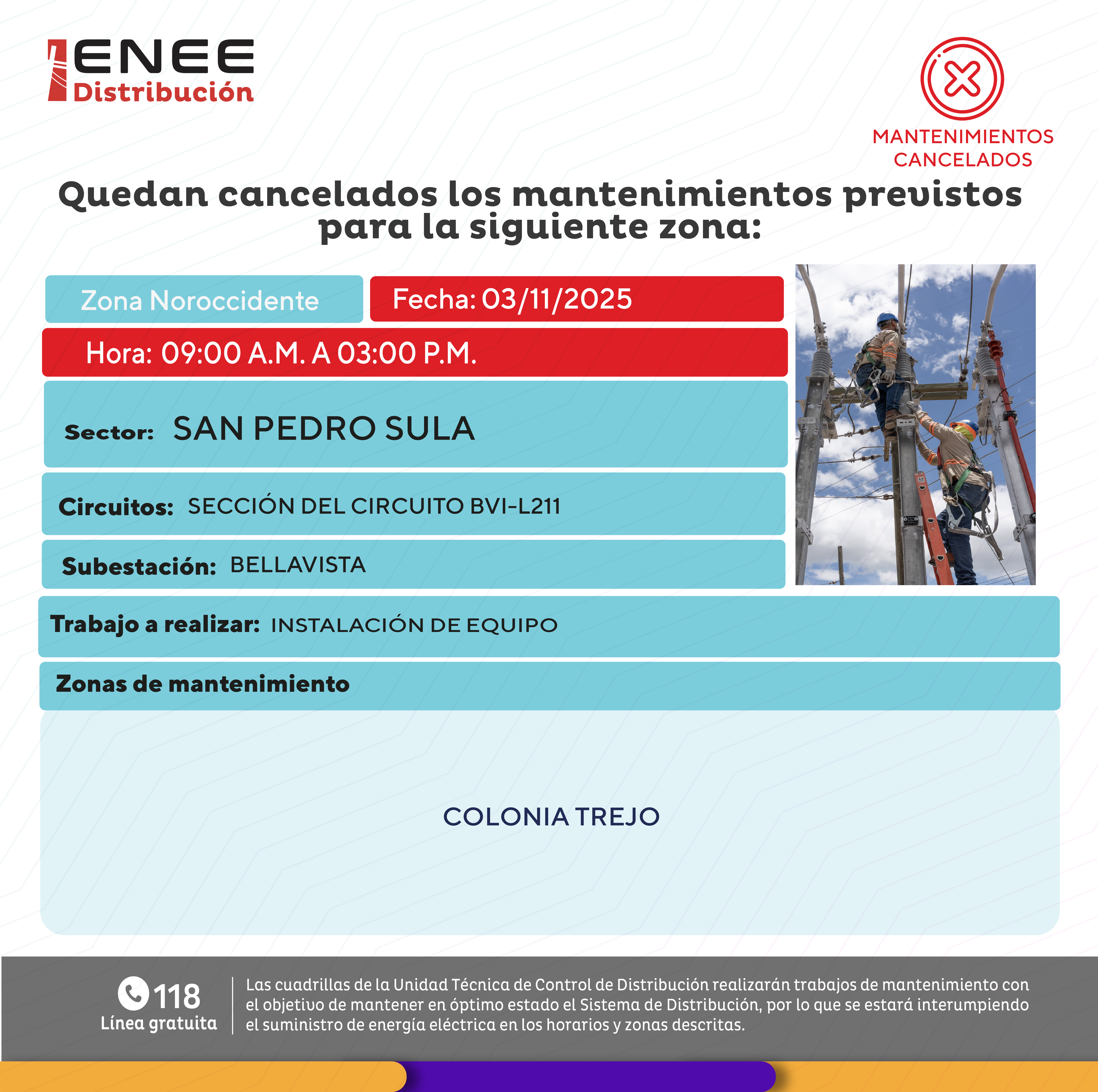 Avisos de Mantenimiento Cancelado - Zona Noroccidente San Pedro Sula lunes 03 noviembre de 2025