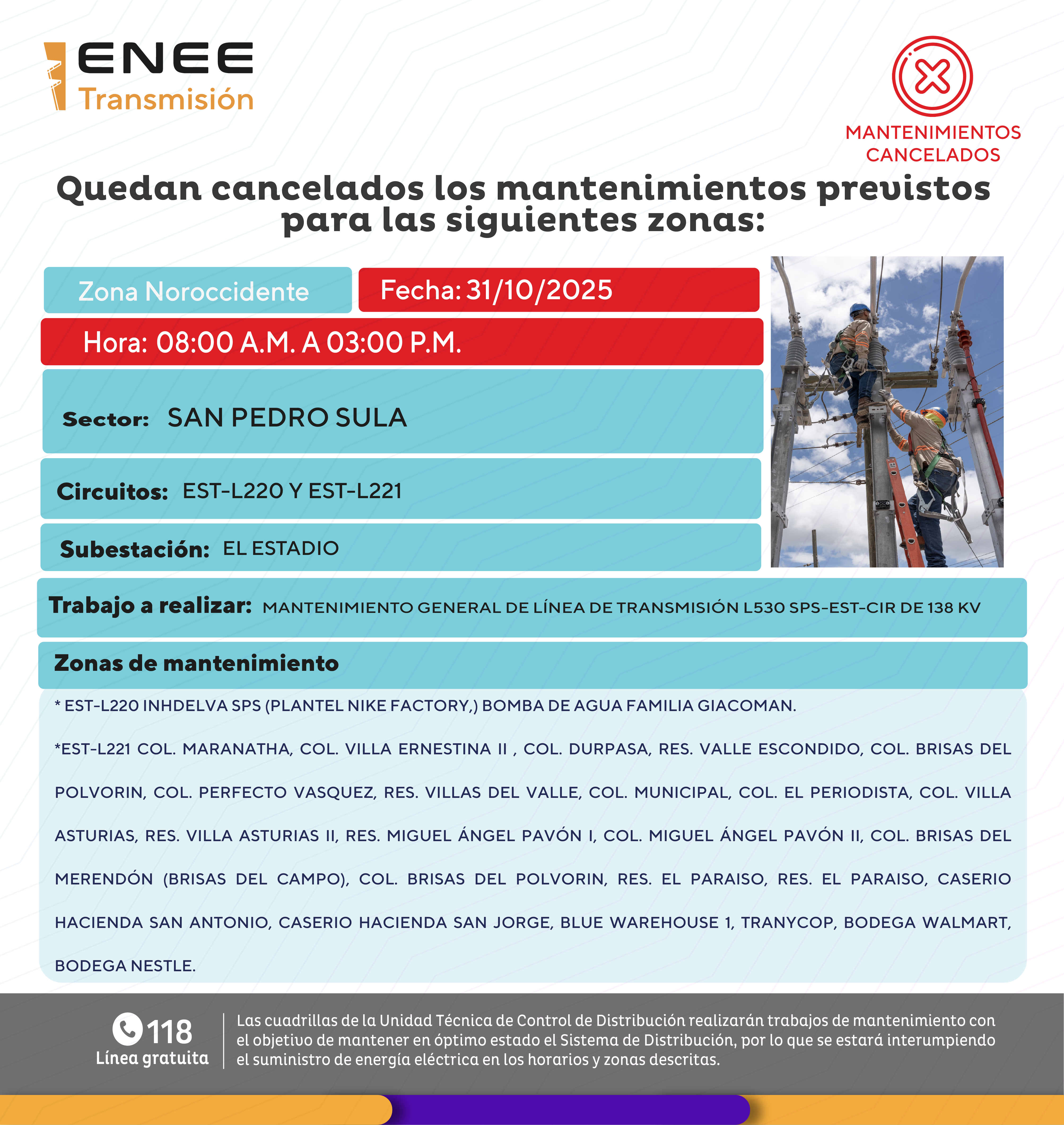 Avisos de Mantenimiento Cancelado - Zona Noroccidente San Pedro Sula viernes 31 de octubre de 2025