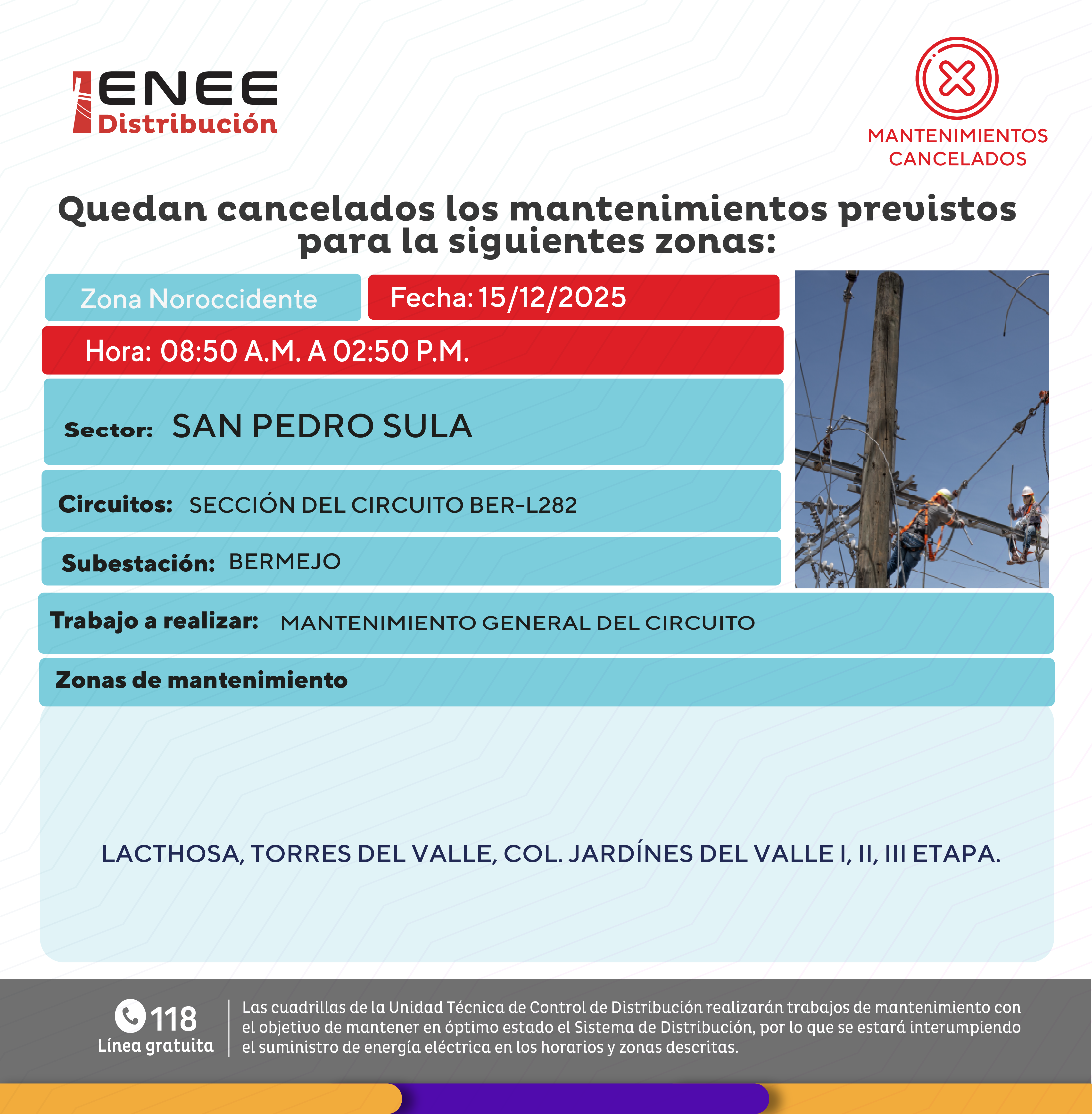 Avisos de Mantenimiento Cancelados - Noroccidente San Pedro Sula lunes 15 de diciembre de 2025