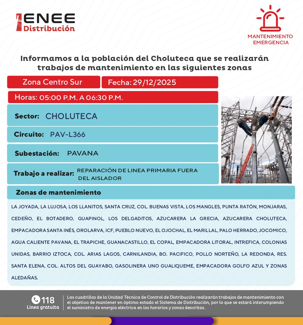 Avisos de Mantenimiento Emergencia - Centro Sur Choluteca lunes 29 de diciembre de 2025