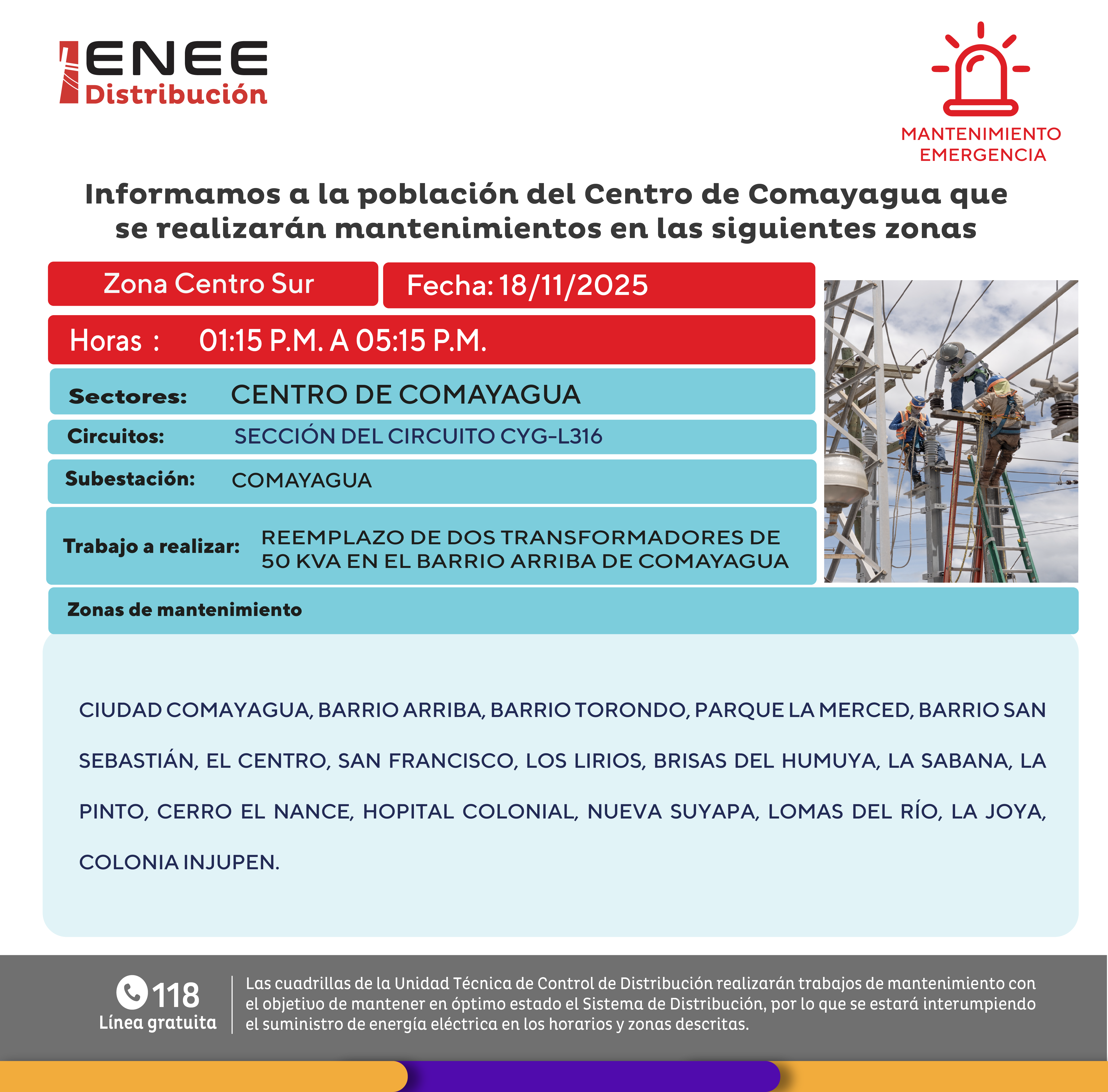 Avisos de Mantenimiento Emergencia - Centro Sur Comayagua martes 18 noviembre de 2025