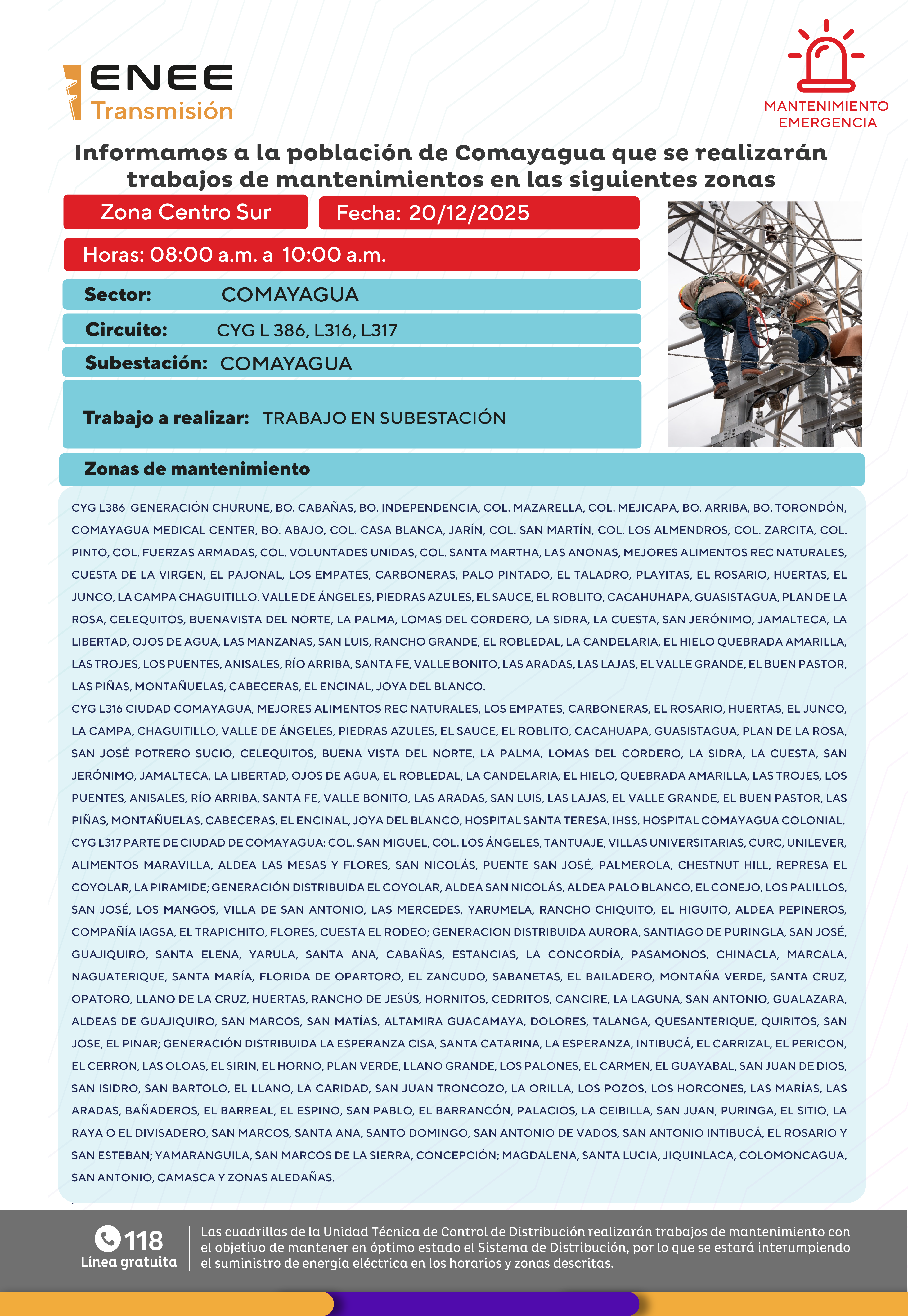 Avisos de Mantenimiento Emergencia - Centro Sur Comayagua sábado 20 de diciembre de 2025