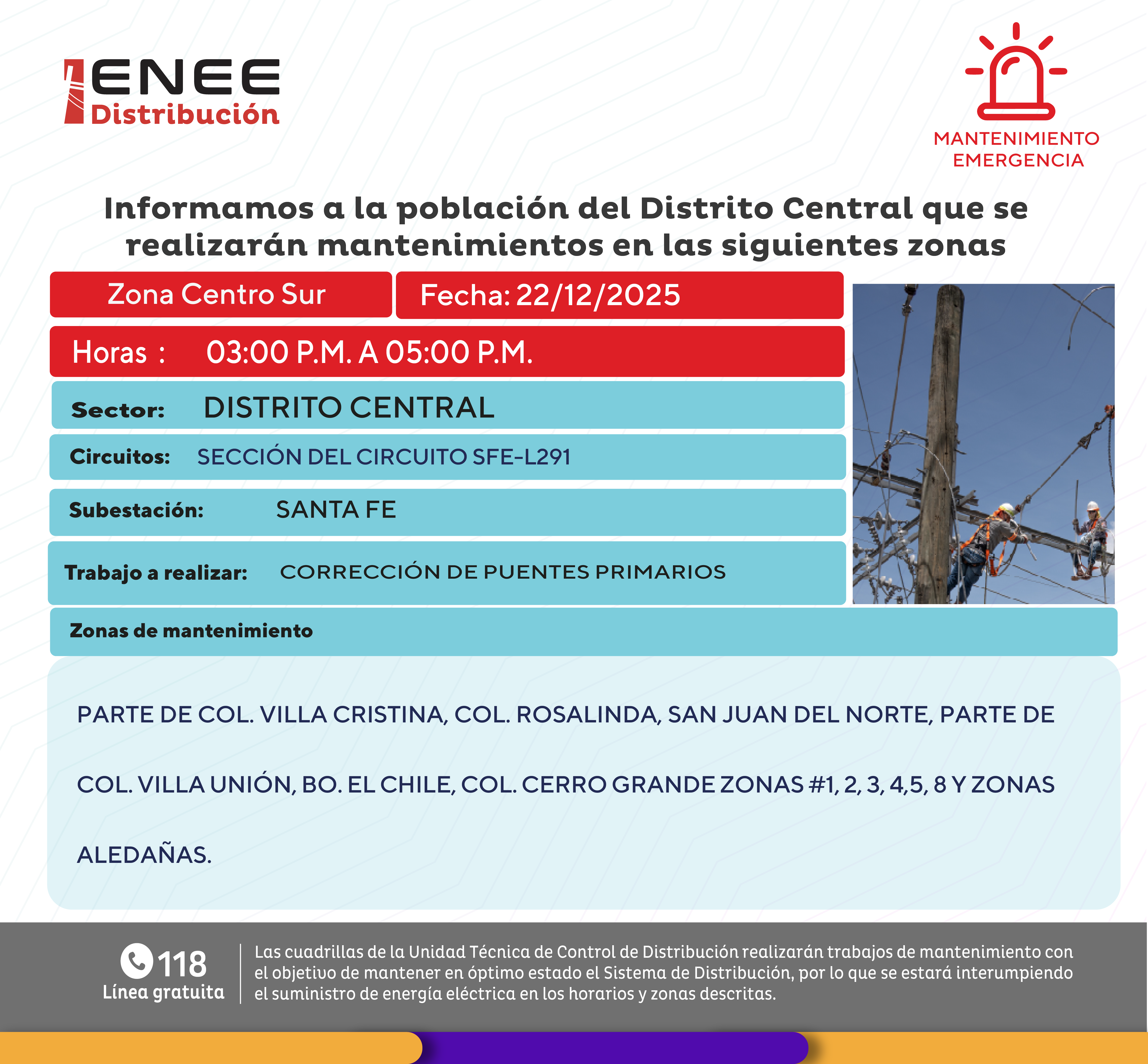Avisos de Mantenimiento Emergencia - Centro Sur Distrito Central lunes 22 de diciembre de 2025
