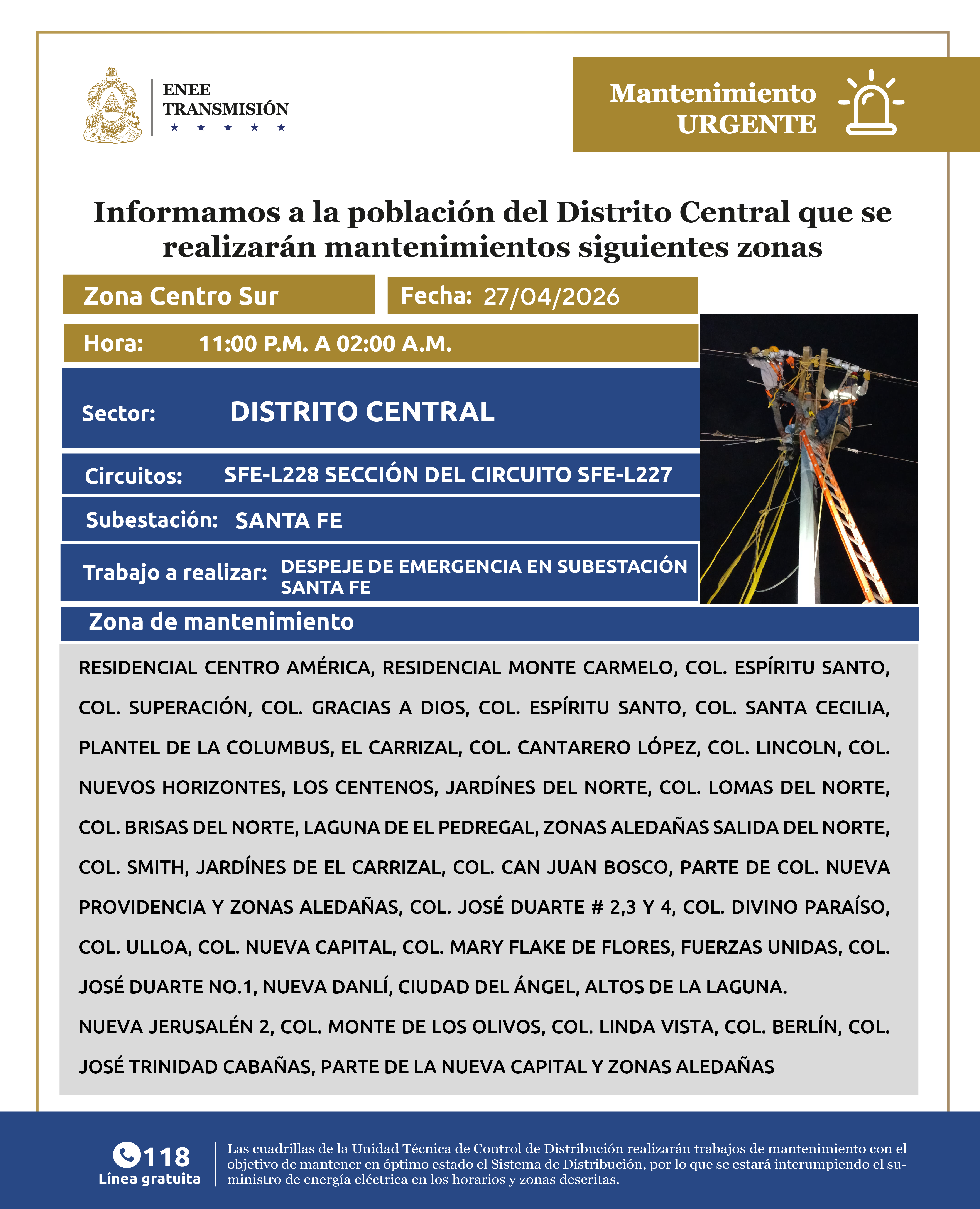 Avisos de Mantenimiento Emergencia - Centro Sur Distrito Central lunes 27 de abril de 2026