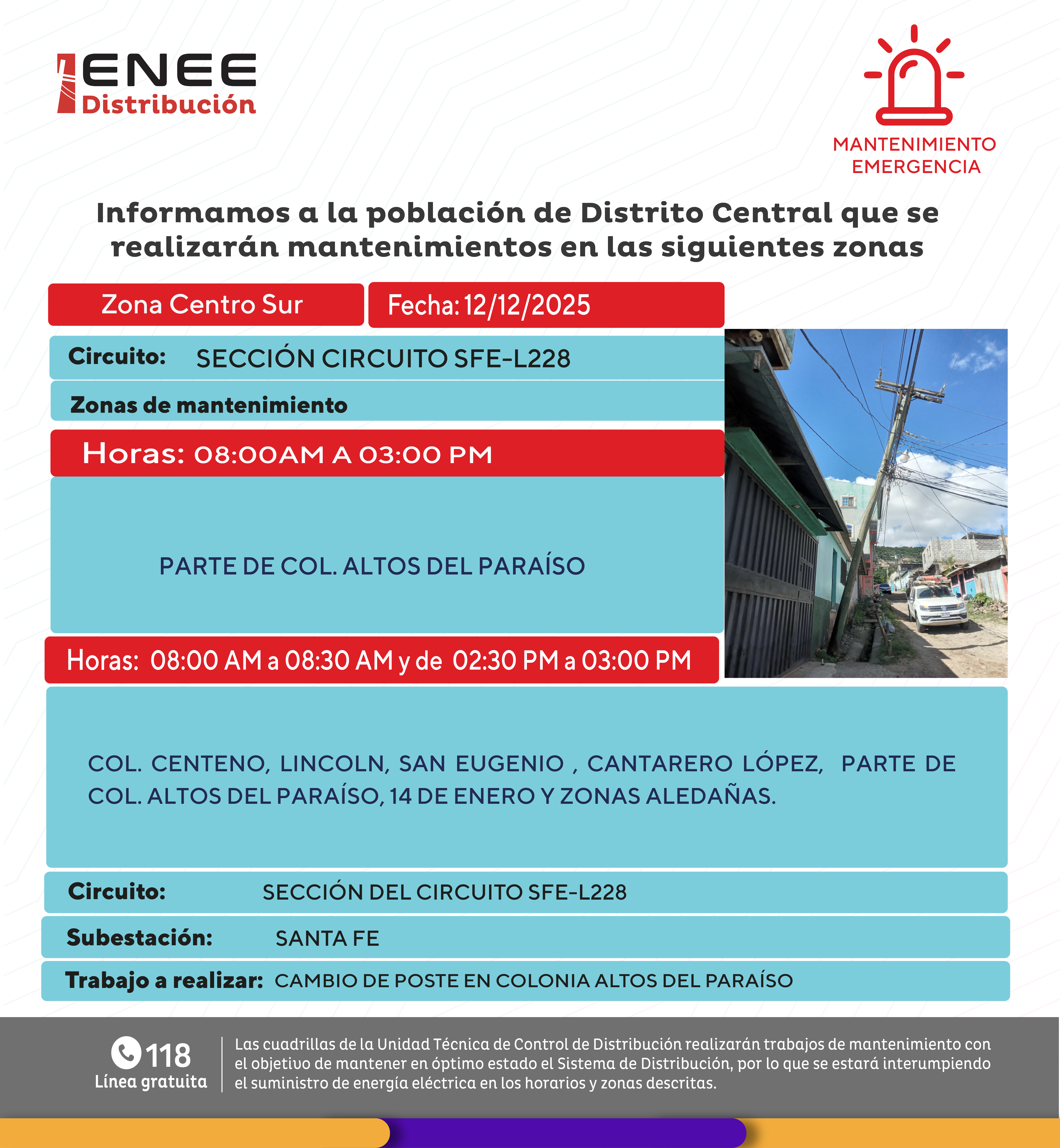Avisos de Mantenimiento Emergencia - Centro Sur Distrito Central viernes 12 de diciembre de 2025
