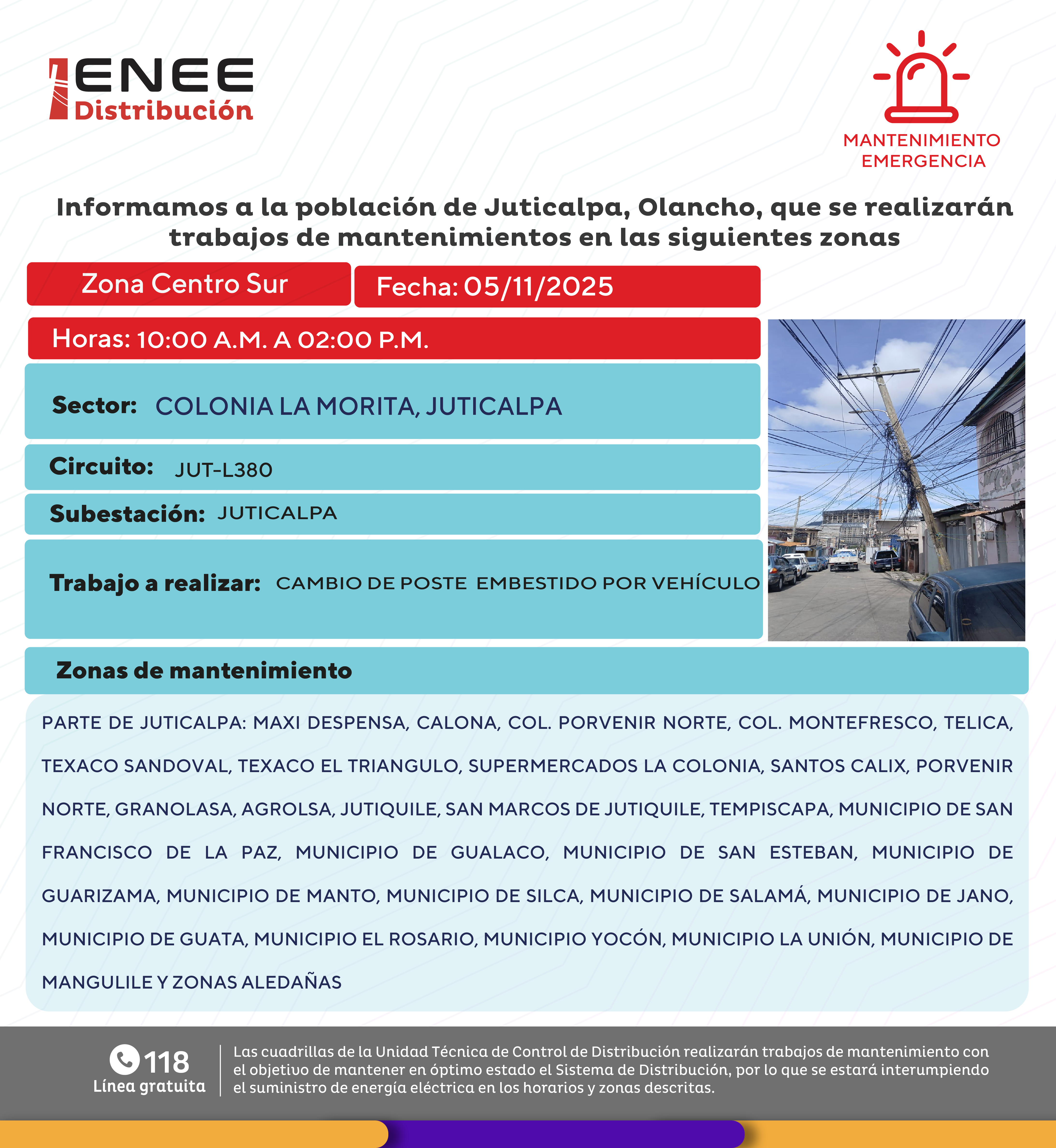 Avisos de Mantenimiento Emergencia -Centro Sur Juticalpa miércoles 05 noviembre de 2025
