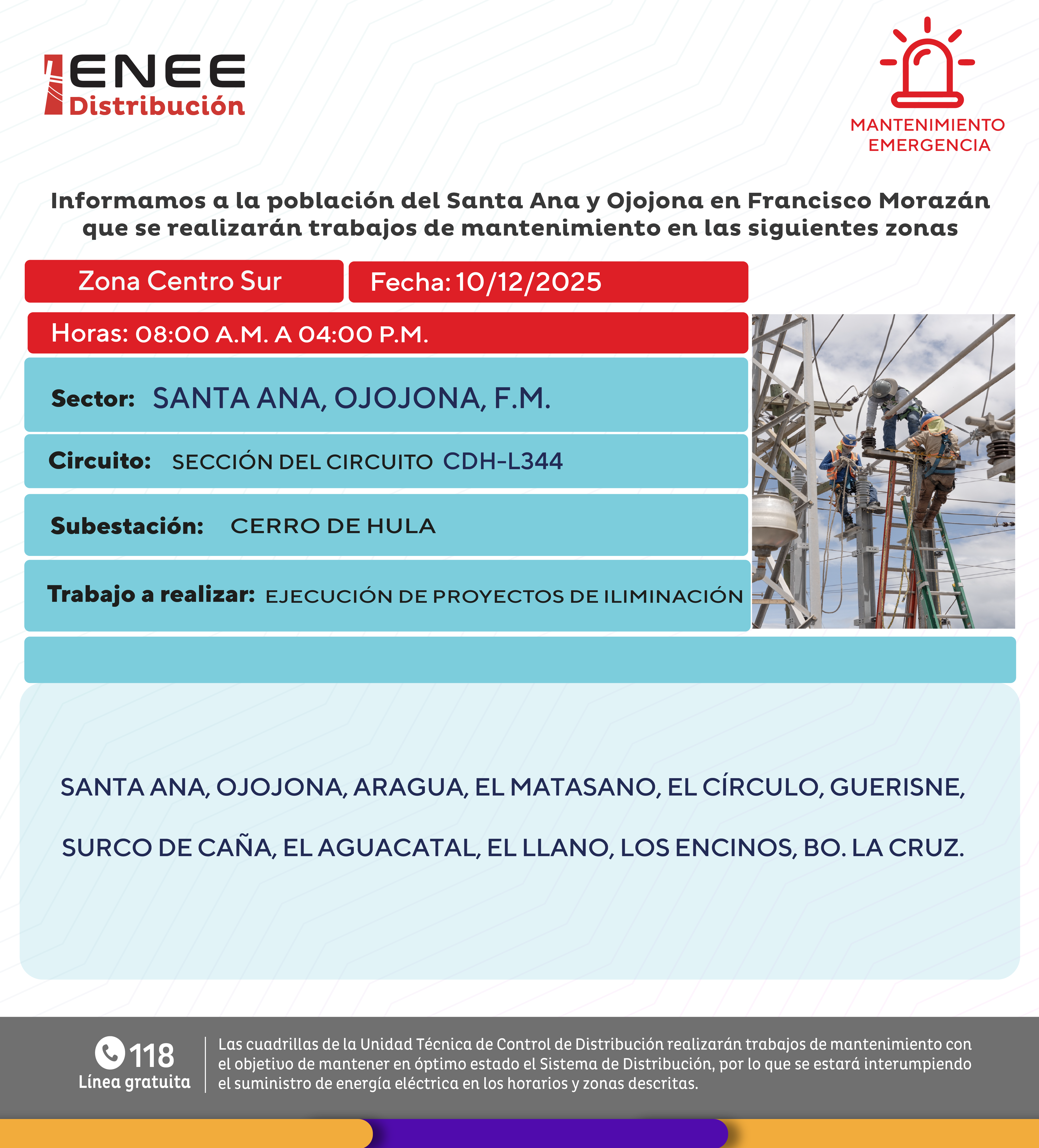 Avisos de Mantenimiento Emergencia - Centro Sur Santa Ana y Ojojona F.M. miércoles 10 de diciembre de 2025