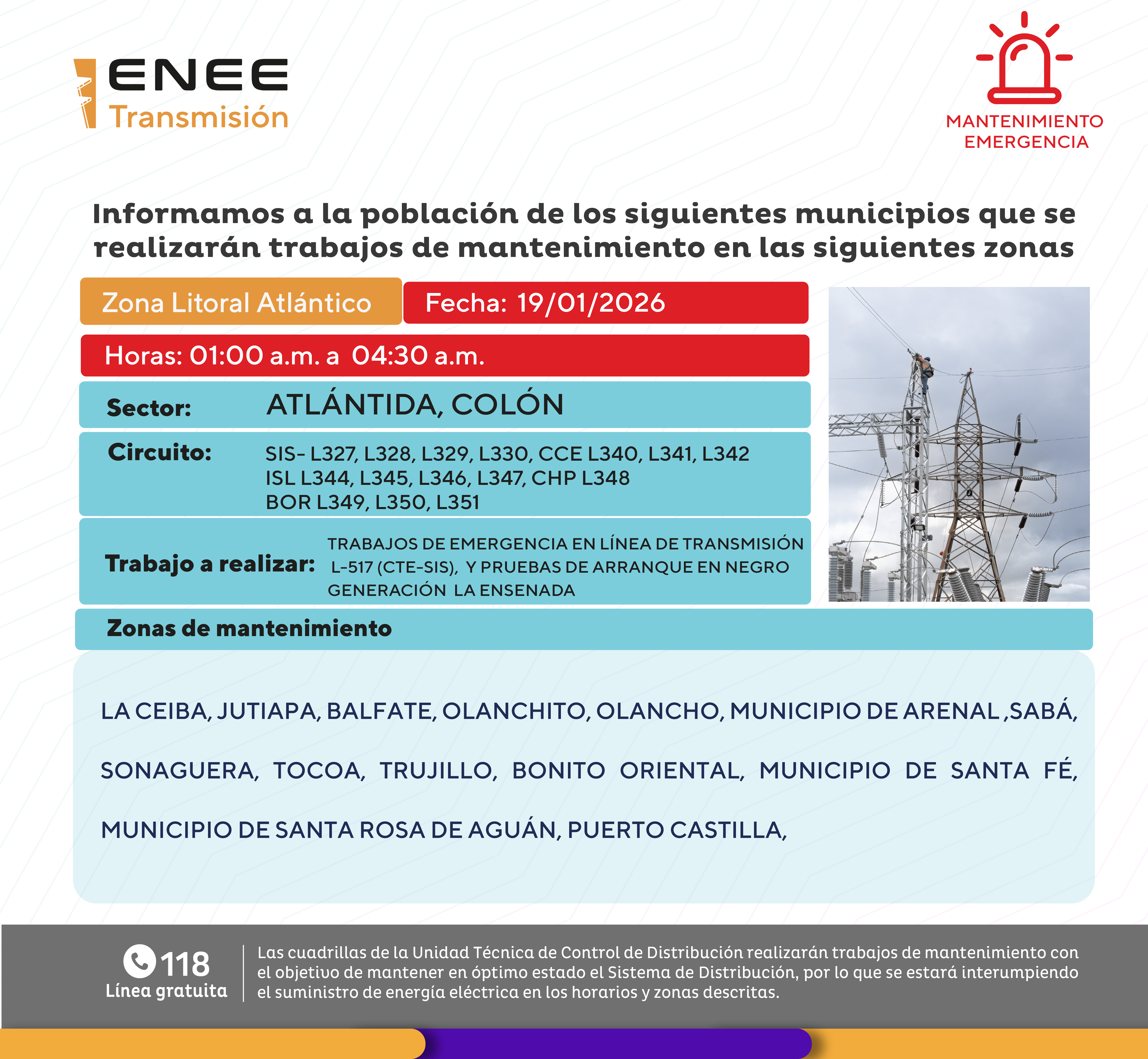 Avisos de Mantenimiento Emergencia - Litoral Atlántico lunes 19 de enero de 2026
