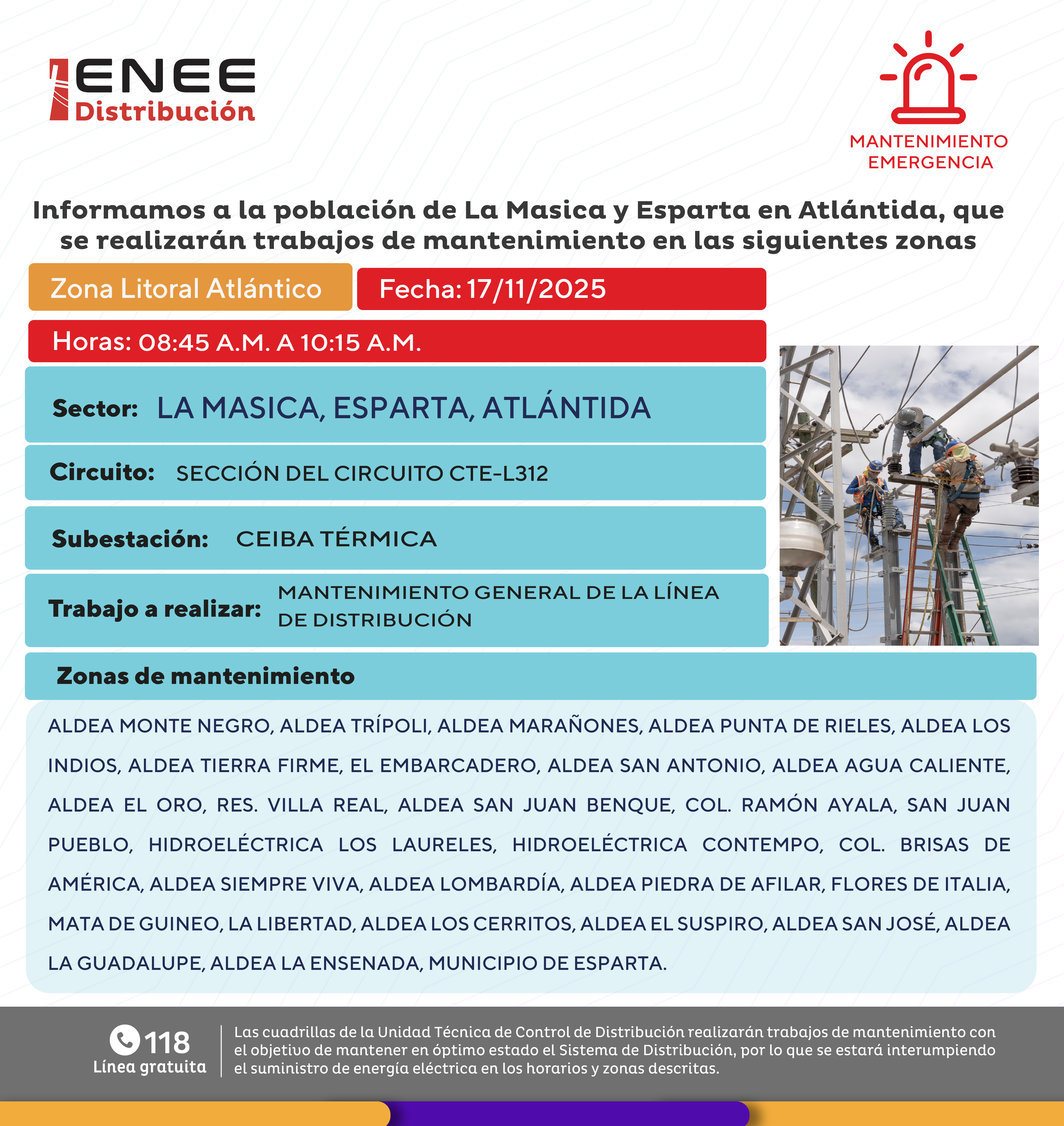 Avisos de Mantenimiento Emergencia - Litoral Atlántico Masica y Esparta lunes 17 noviembre de 2025
