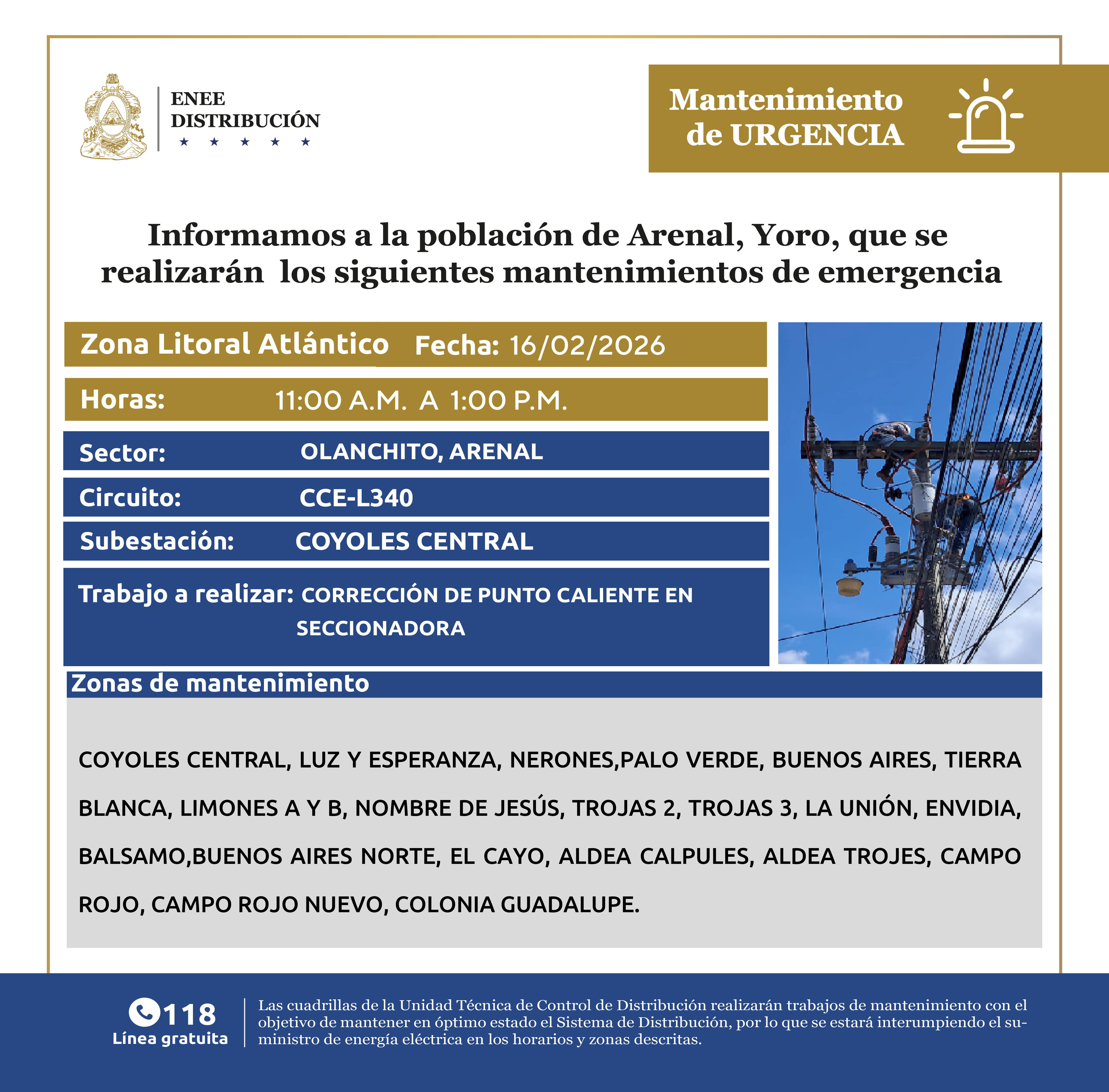 Avisos de Mantenimiento Emergencia - Litoral Atlántico Olanchito, Yoro lunes 16 de febrero de 2026
