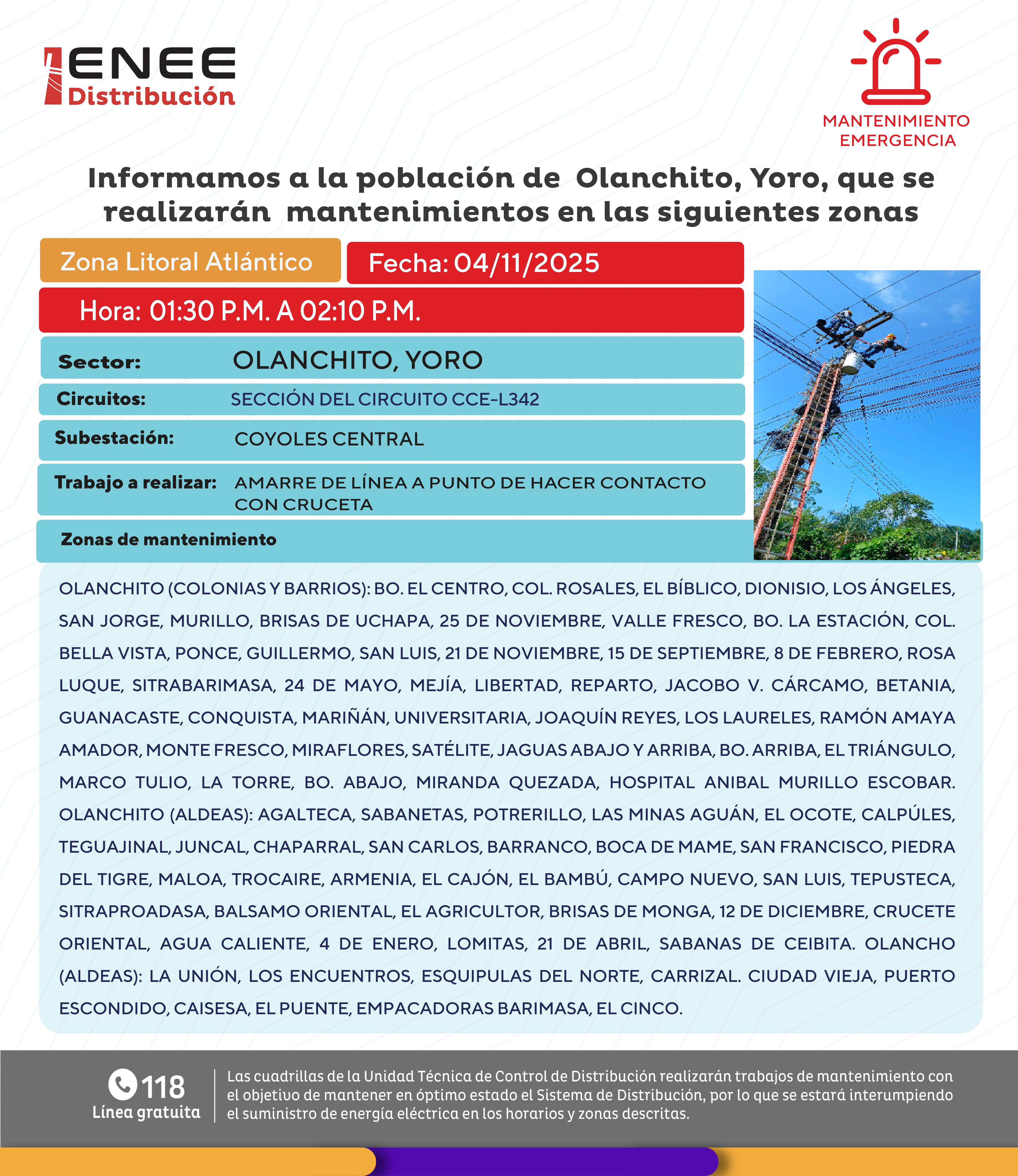 Avisos de Mantenimiento Emergencia - Litoral Atlántico Olanchito, Yoro martes 04 noviembre de 2025