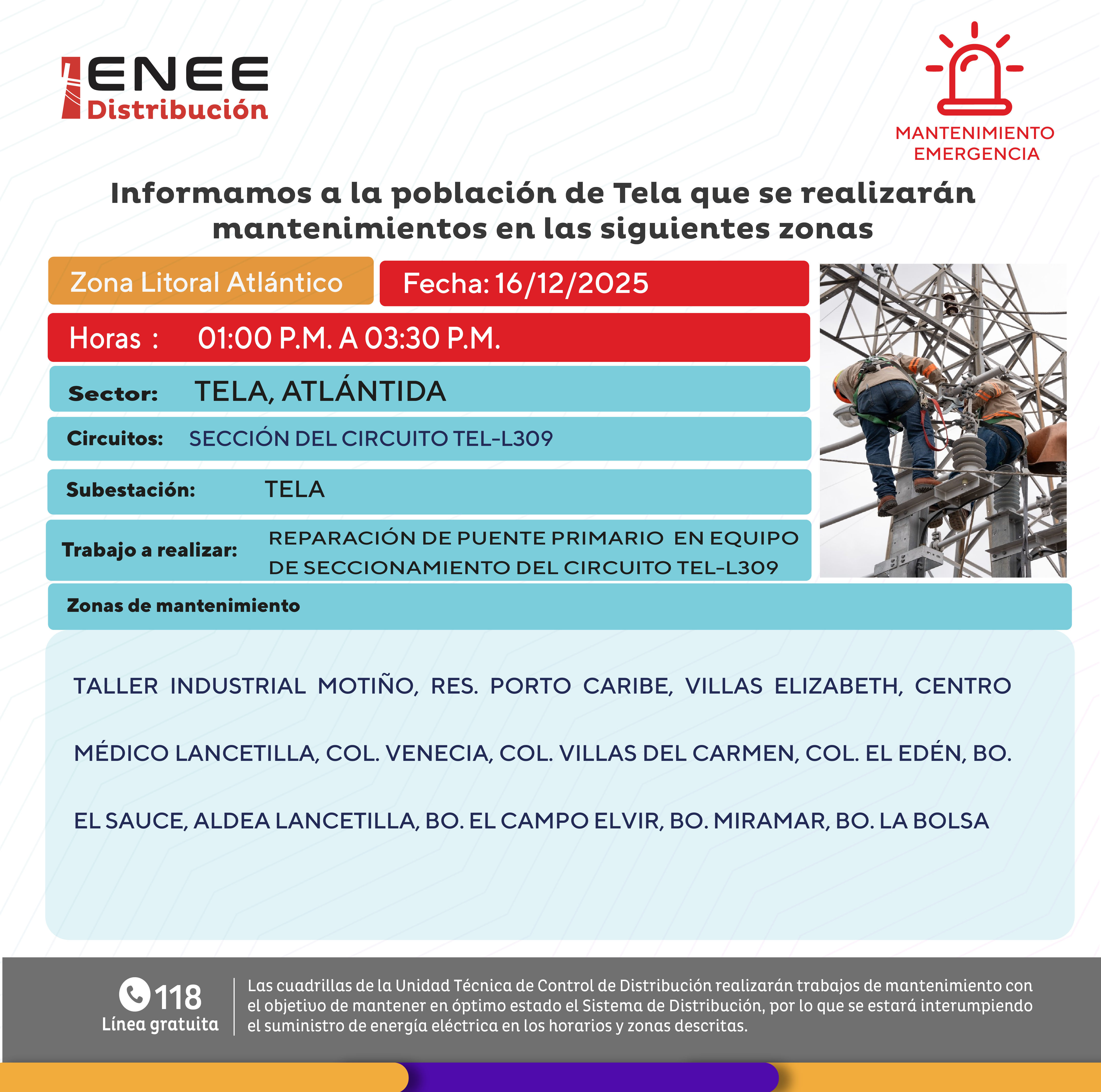 Avisos de Mantenimiento Emergencia - Litoral Atlántico Tela martes 16 de diciembre de 2025